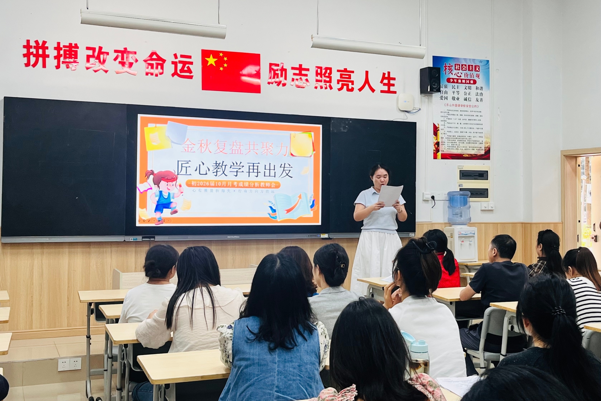 战鼓擂响催奋进,号角声声励新程。7月7日,乐山外国语学校初2026届举行了以“知不足而前进,望远山而力行”为主题的期末教师会。会议由年级组长廖艳主持,校长杨玲、副校长徐乐乐出席会议,初2026届全体教师齐聚一堂,共同吹响奋战新初三的集结号。