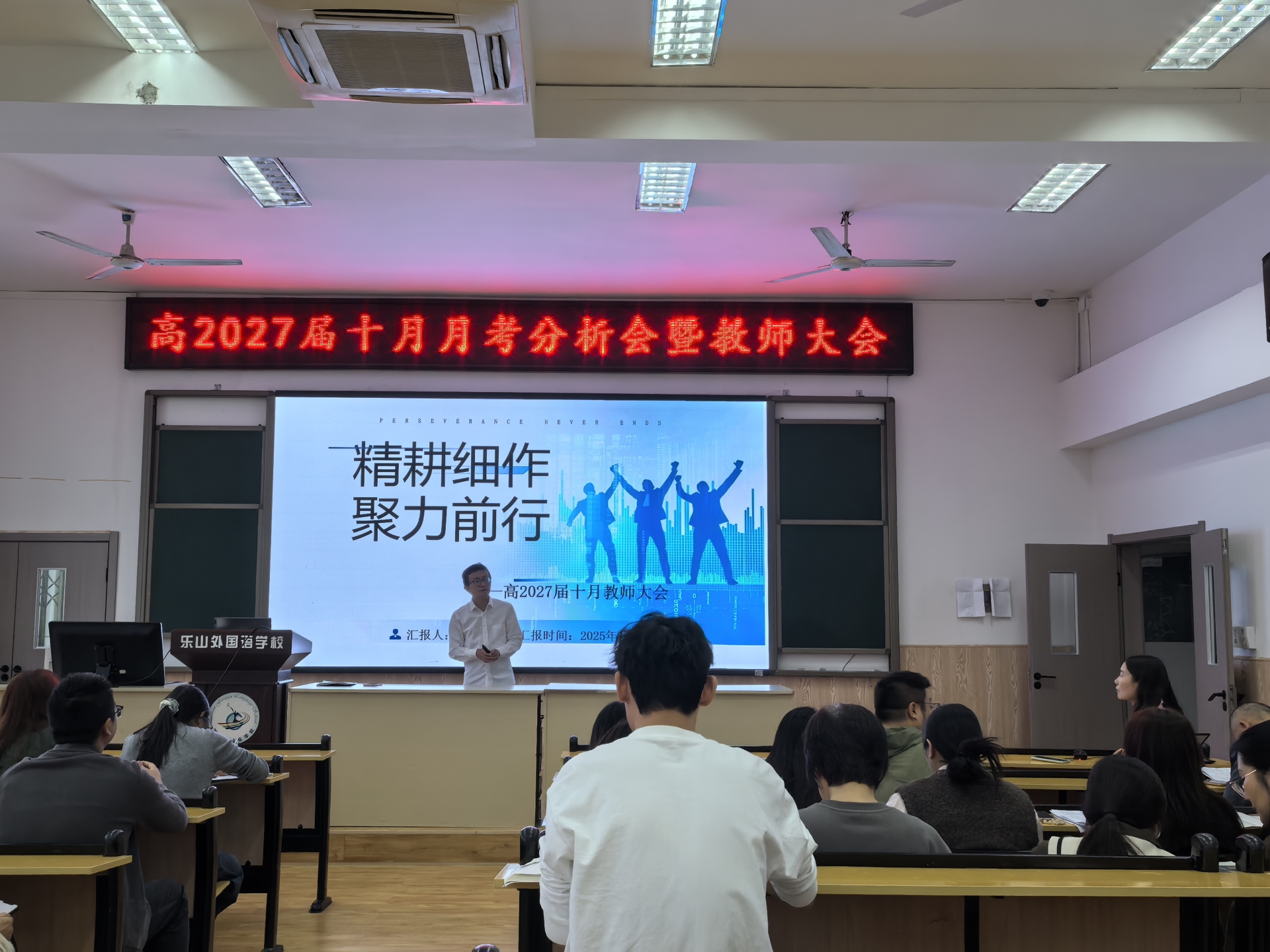 秋意渐浓,学意正酣。10月20日,高2027届举行了十月月考分析会暨全体教师大会。本次大会以“精耕细作,聚力前行”为主题,不仅是一次对过往教学工作的深刻复盘会,更是一次凝聚共识、明确未来航向的动员会。会议围绕成绩分析、目标规划、工作回顾与教学艺术等核心议题层层展开,为新征程注入了满满的思考与能量。大会由副校长谢红军主讲,校长余辉及高2027届全体教师参会。