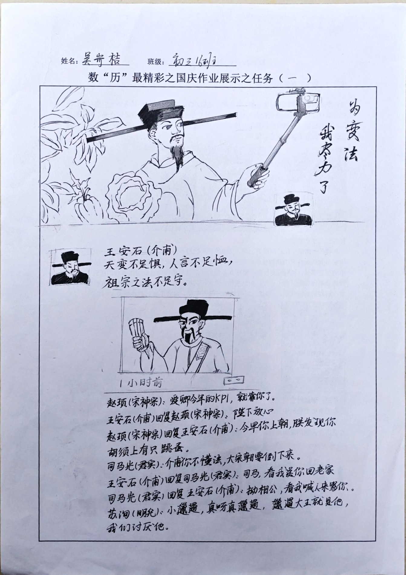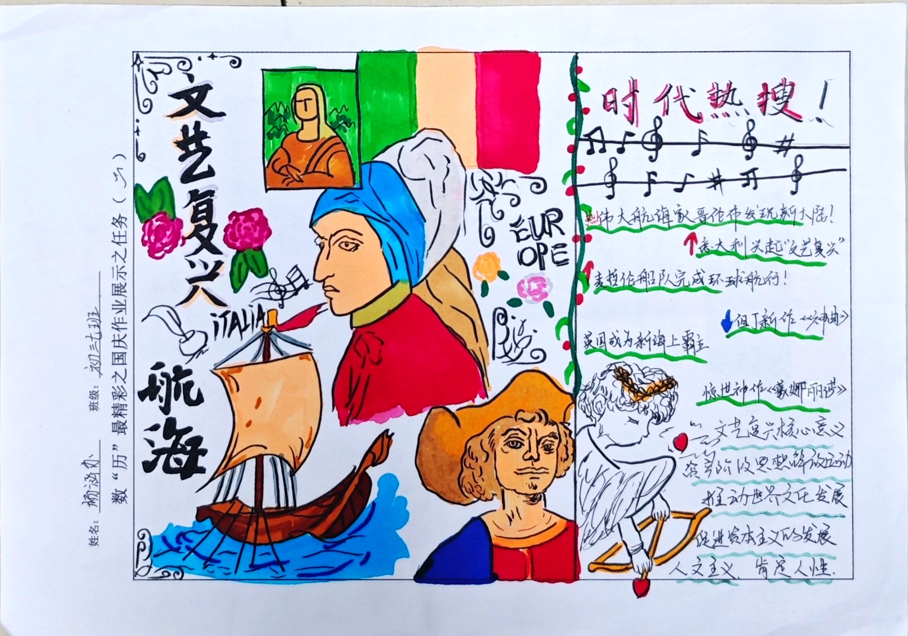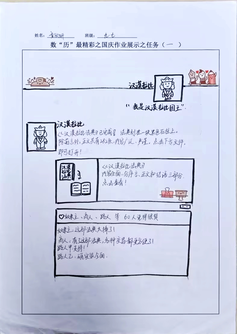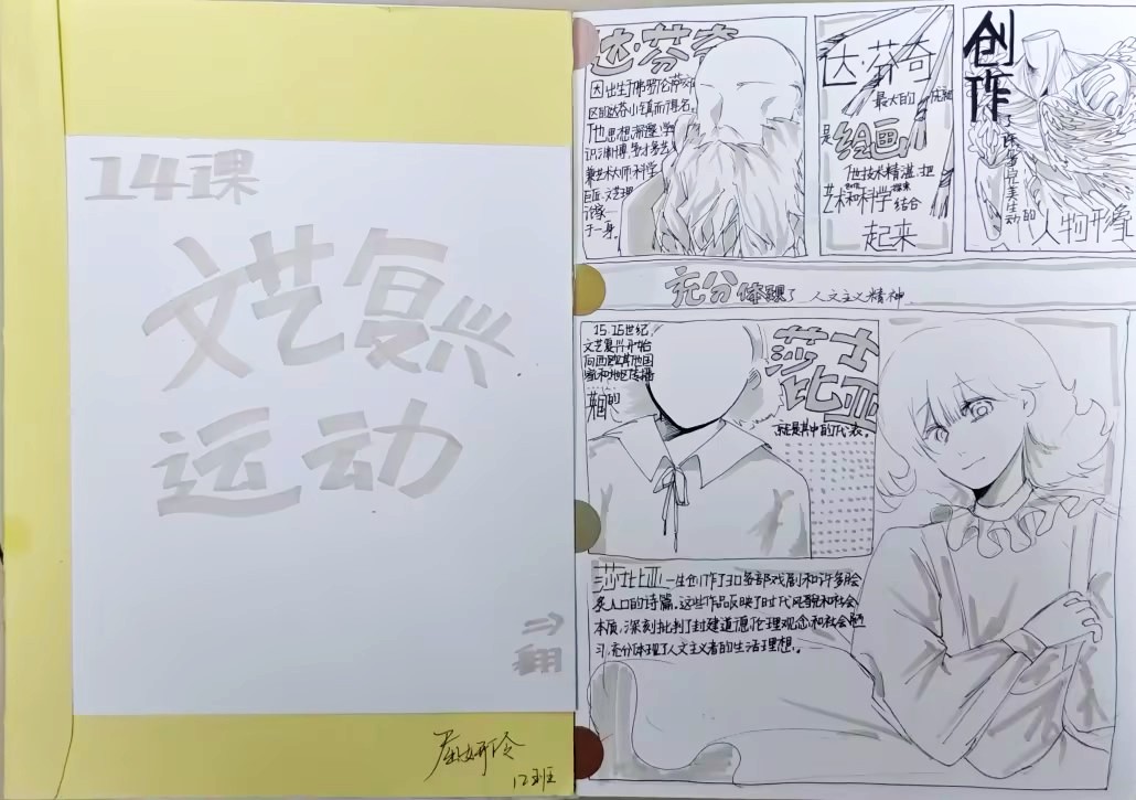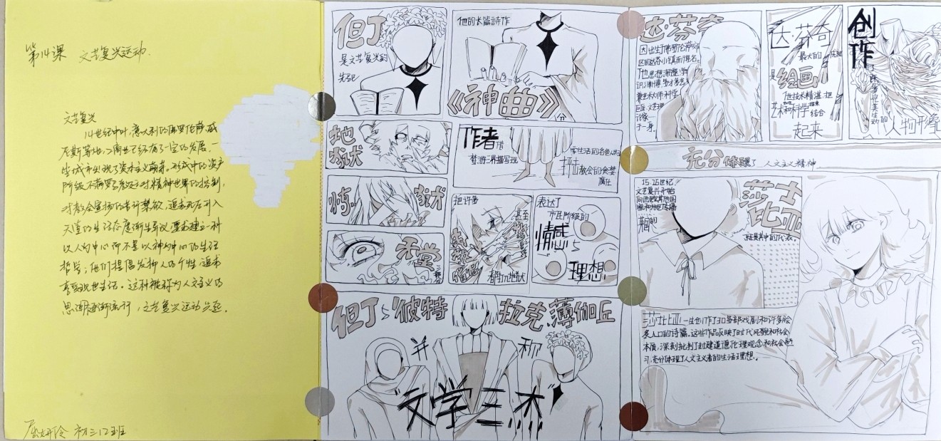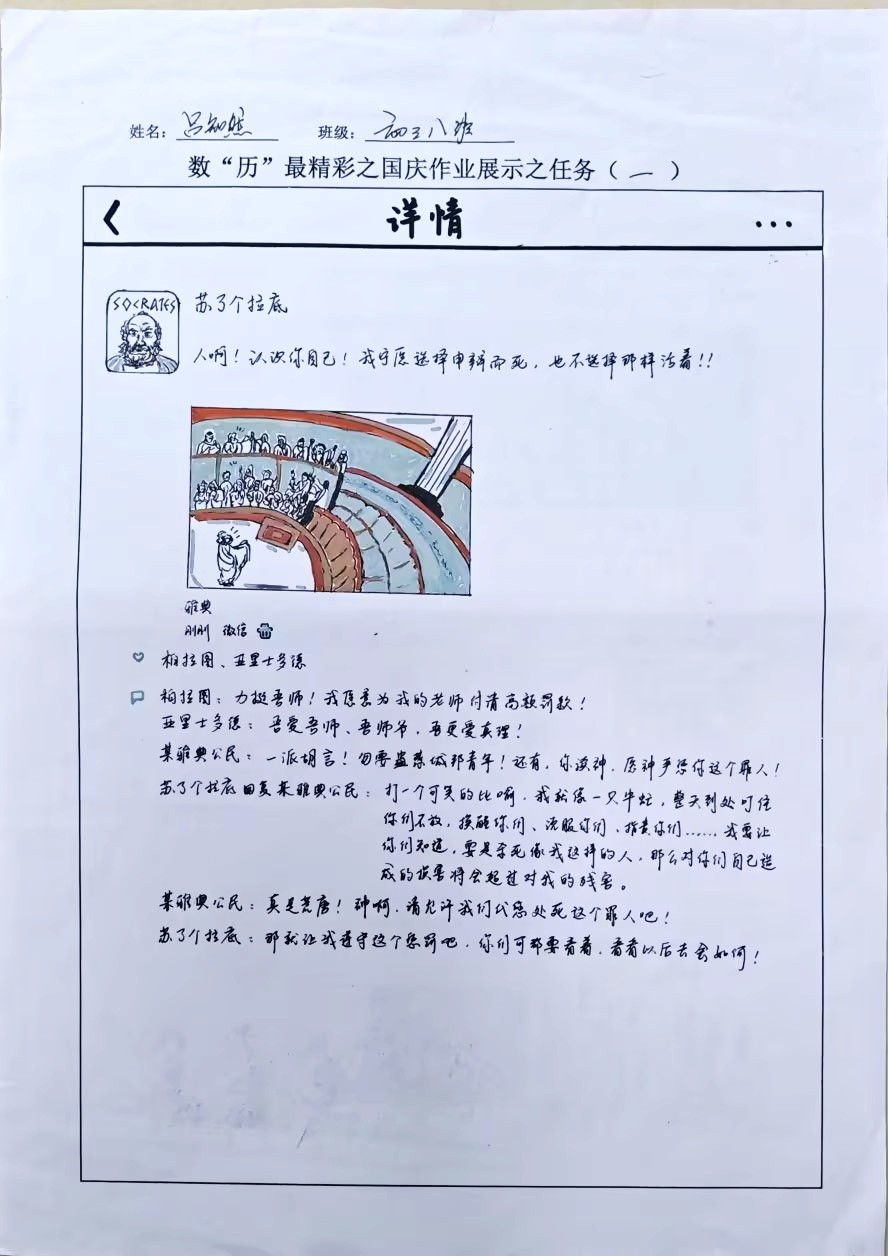 在这些特别的作业项目中,每一位同学都化身为小小历史学家兼艺术家,穿梭于古今,从浩瀚的历史长河中汲取灵感,将那些或辉煌、或悲壮的历史瞬间,巧妙融入一张张独一无二的A4纸中。有的作品描摹了波澜壮阔的历史事件,用细腻的笔触勾勒出历史长河中的风风雨雨,让我们感受世事的沧桑变化;有的则聚焦于璀璨的文明遗迹,通过精美的图案和文字注解,让我们仿佛穿越时空,亲眼见证那些灿烂文明的辉煌与衰落;也有作品以历史人物为主题,浮现出一个又一个鲜活的面孔,让我们从微观的个体视角感受历史的深邃。