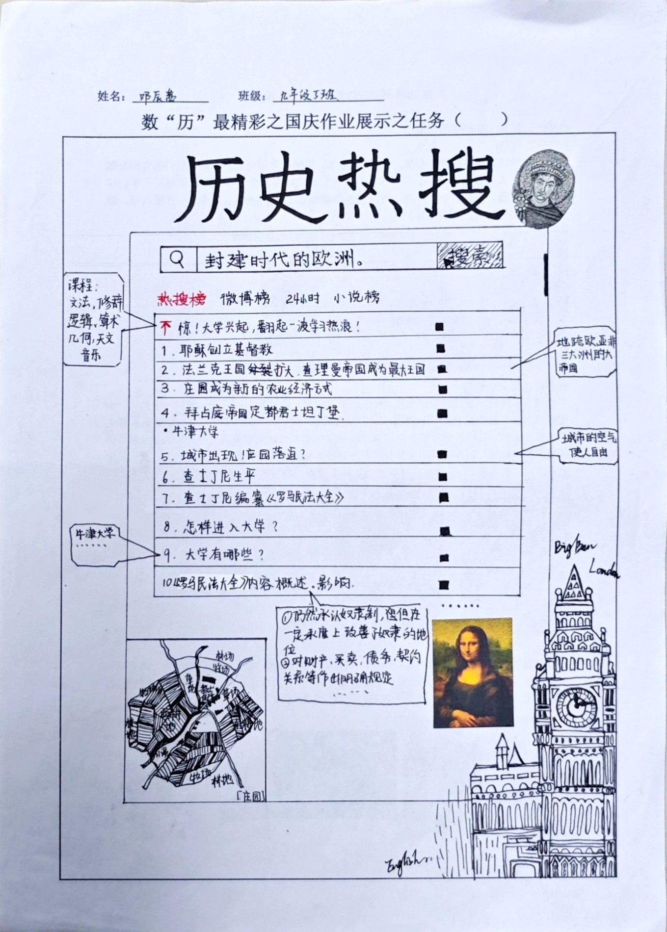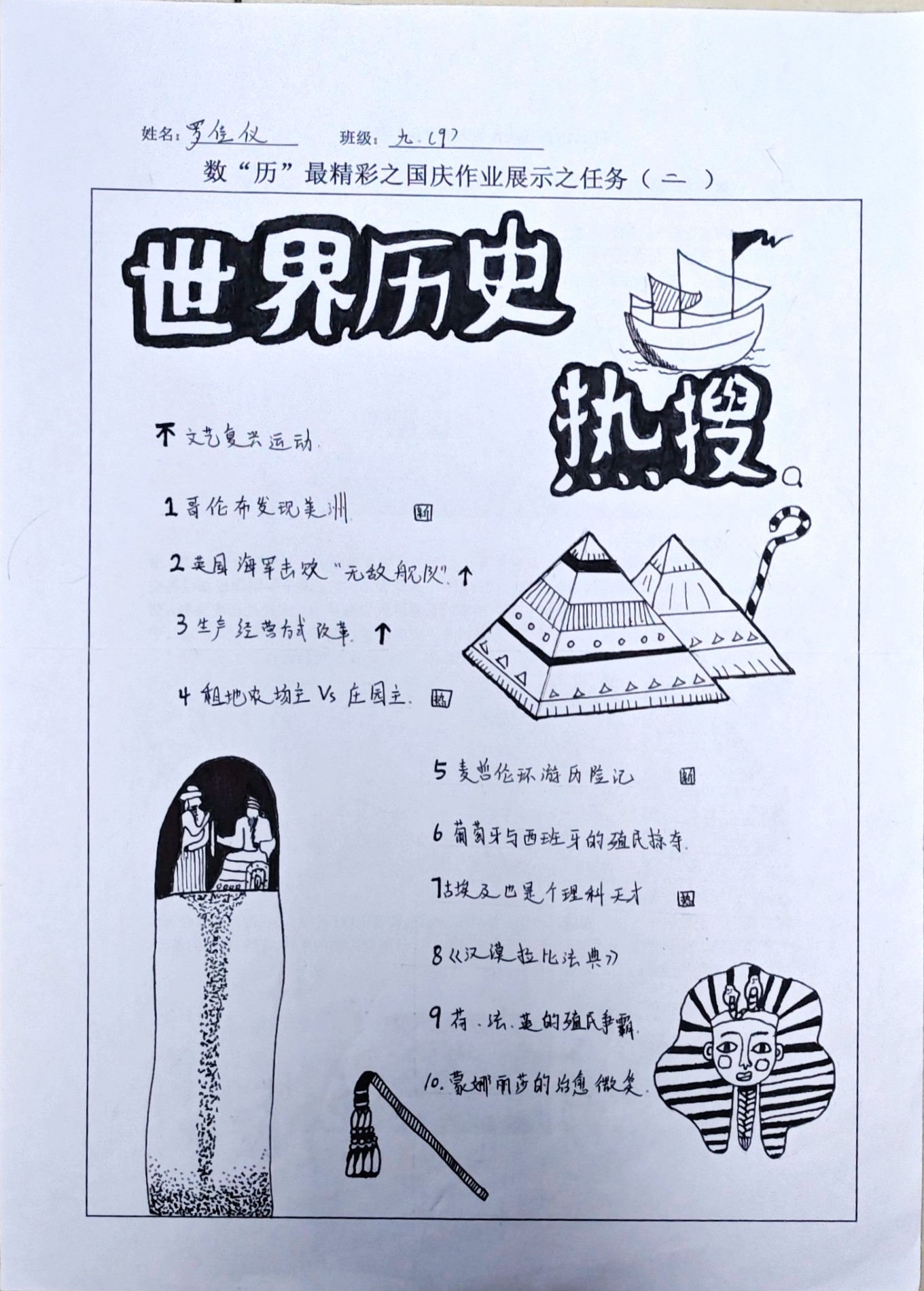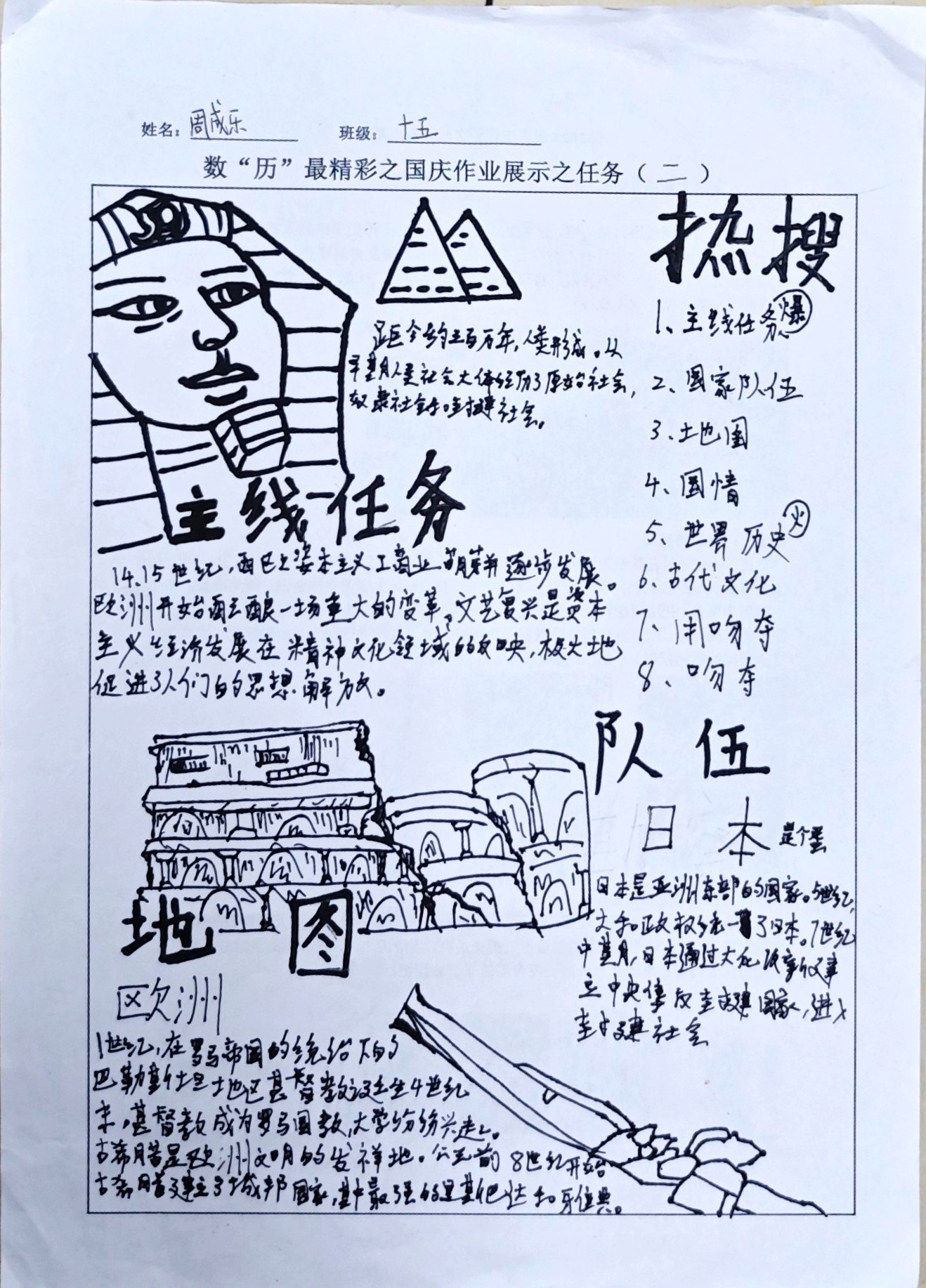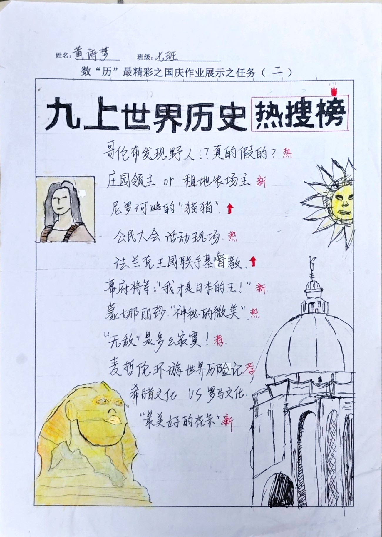 在这些特别的作业项目中,每一位同学都化身为小小历史学家兼艺术家,穿梭于古今,从浩瀚的历史长河中汲取灵感,将那些或辉煌、或悲壮的历史瞬间,巧妙融入一张张独一无二的A4纸中。有的作品描摹了波澜壮阔的历史事件,用细腻的笔触勾勒出历史长河中的风风雨雨,让我们感受世事的沧桑变化;有的则聚焦于璀璨的文明遗迹,通过精美的图案和文字注解,让我们仿佛穿越时空,亲眼见证那些灿烂文明的辉煌与衰落;也有作品以历史人物为主题,浮现出一个又一个鲜活的面孔,让我们从微观的个体视角感受历史的深邃。