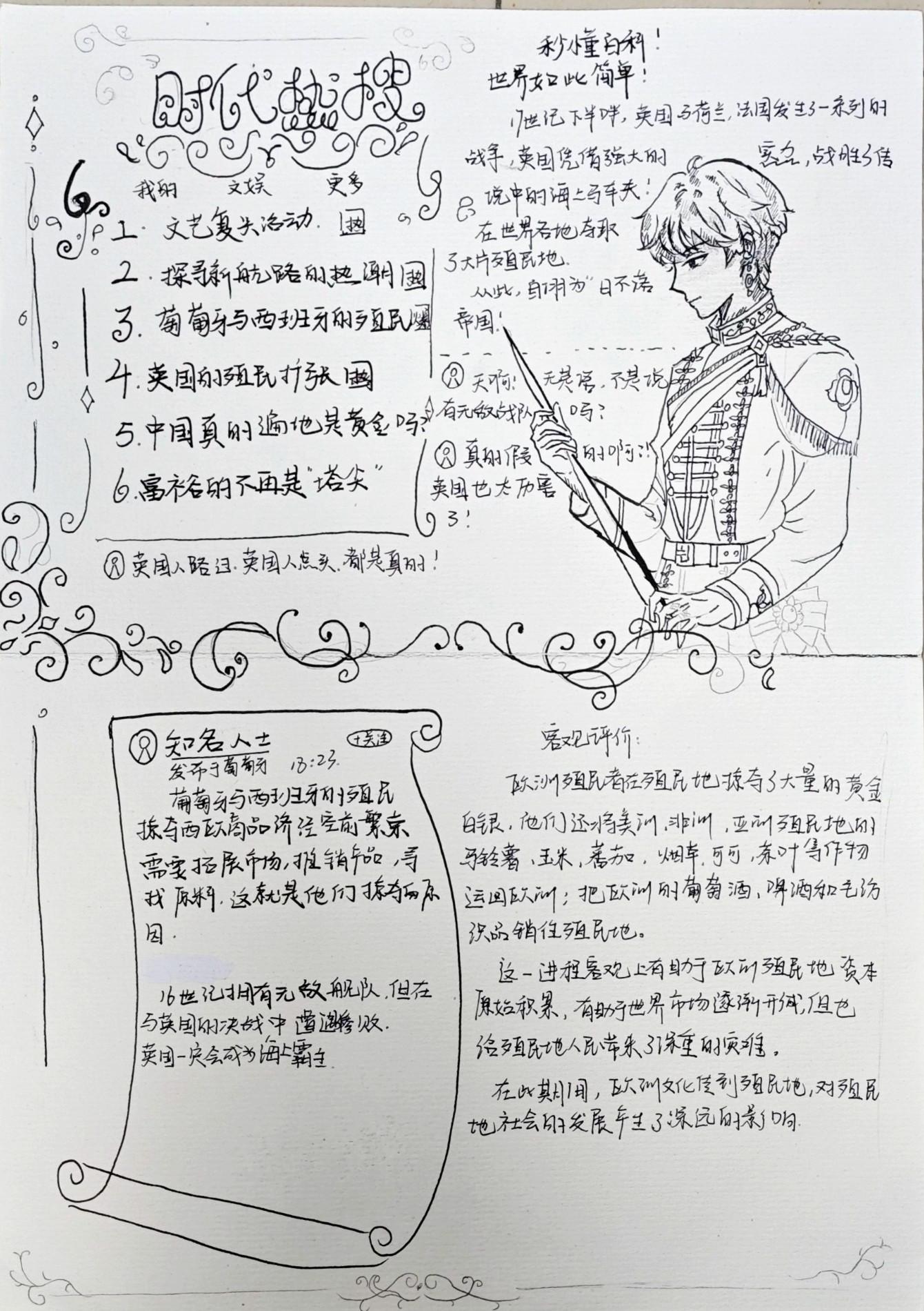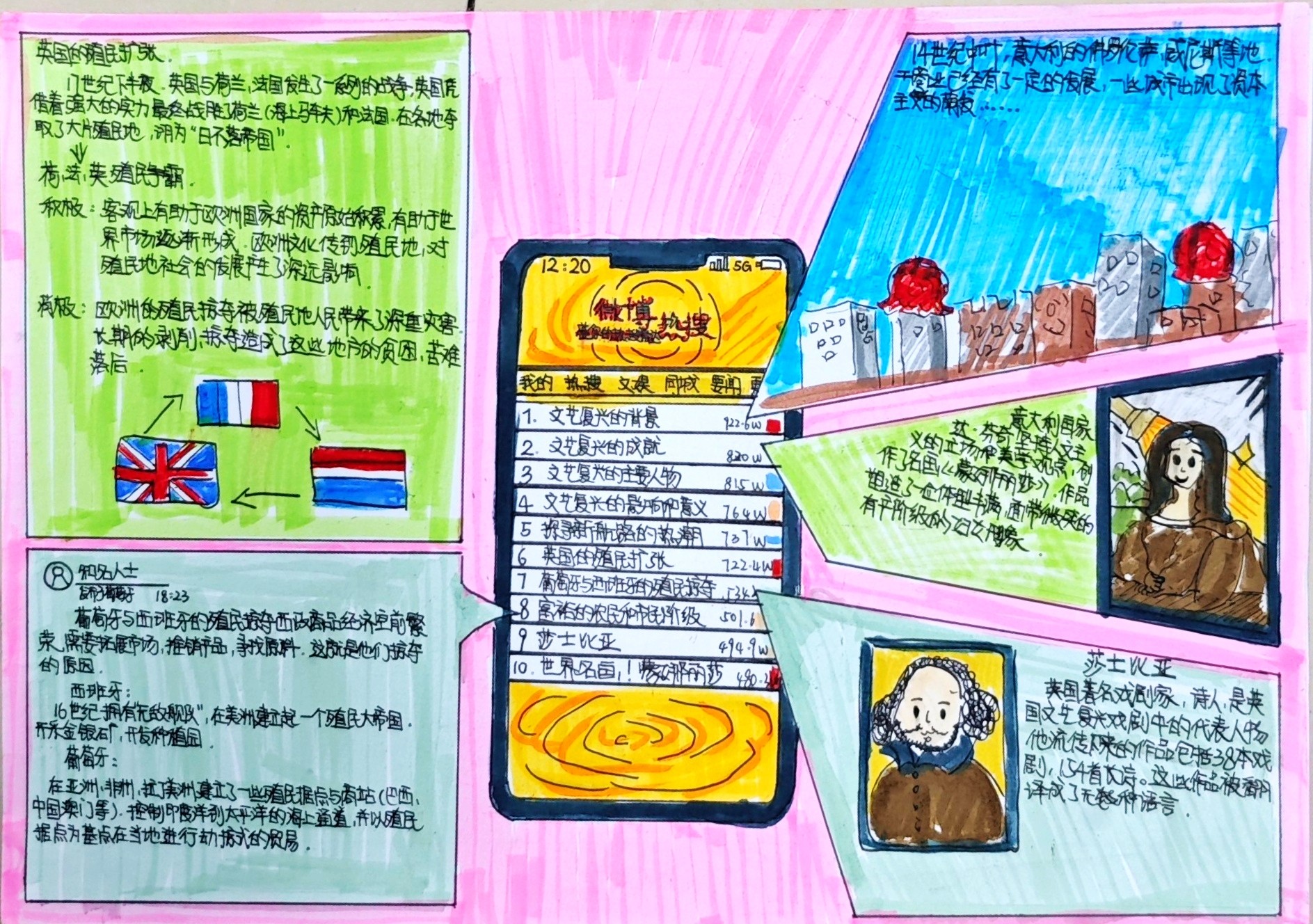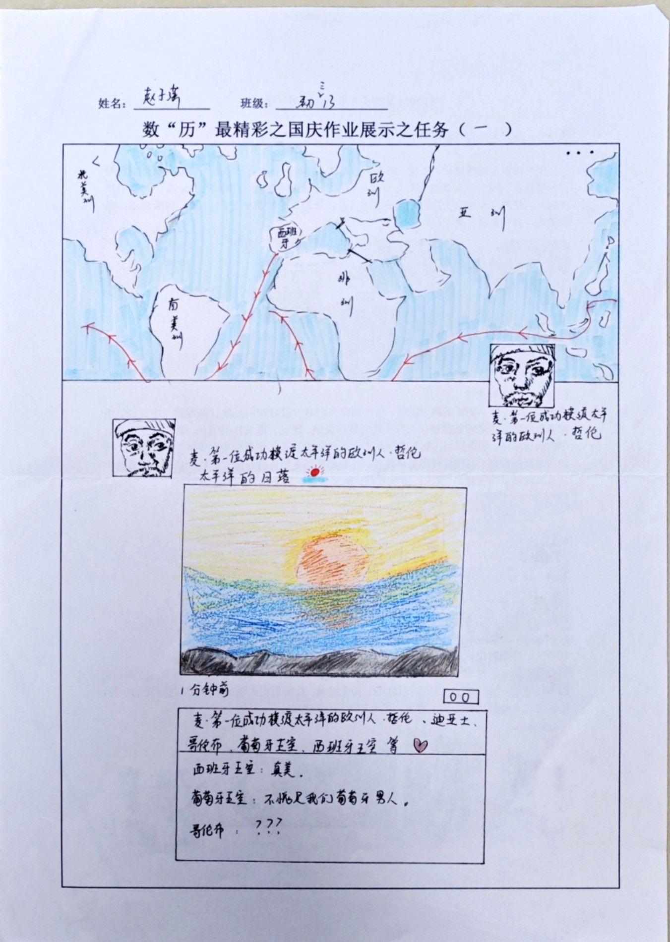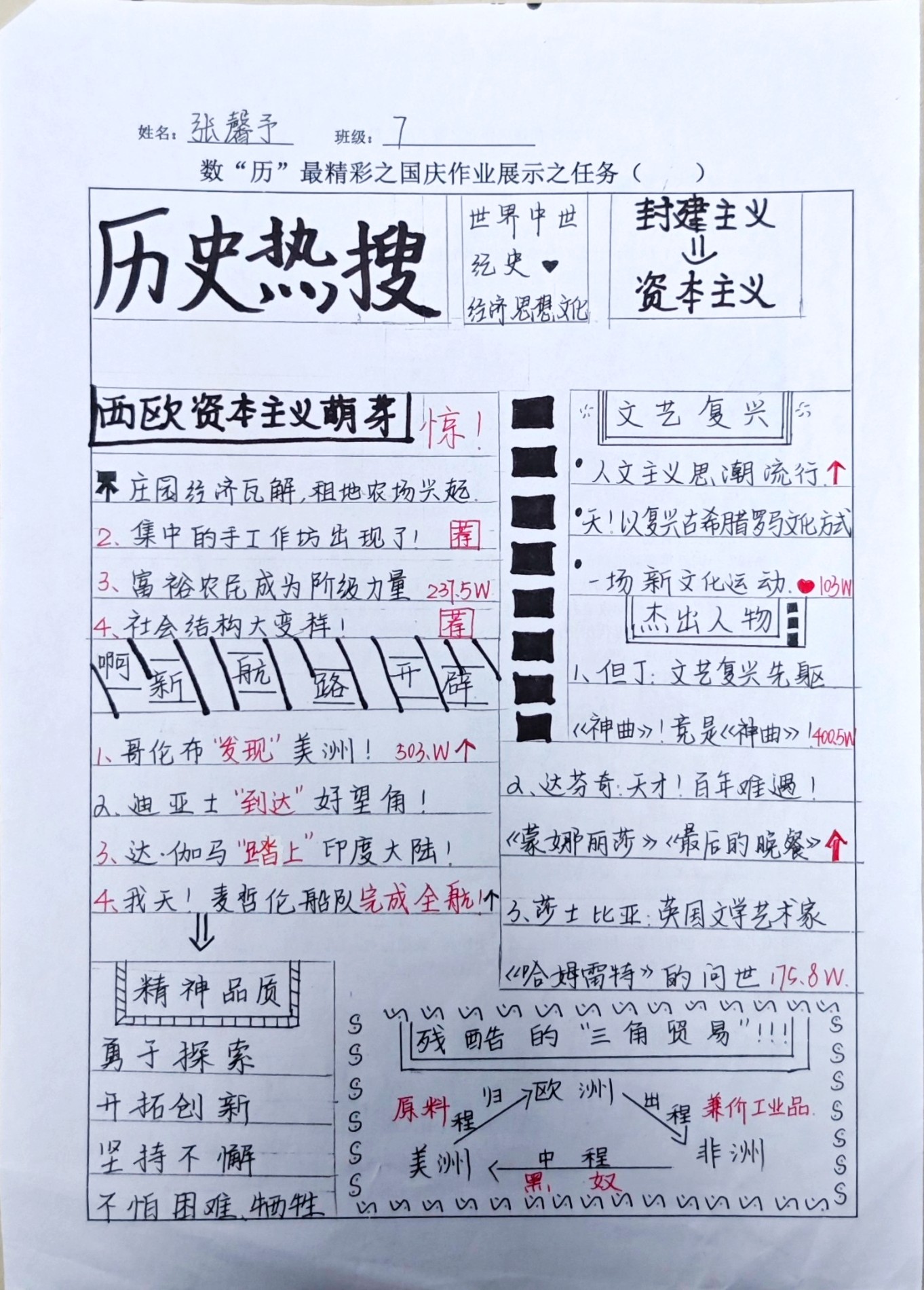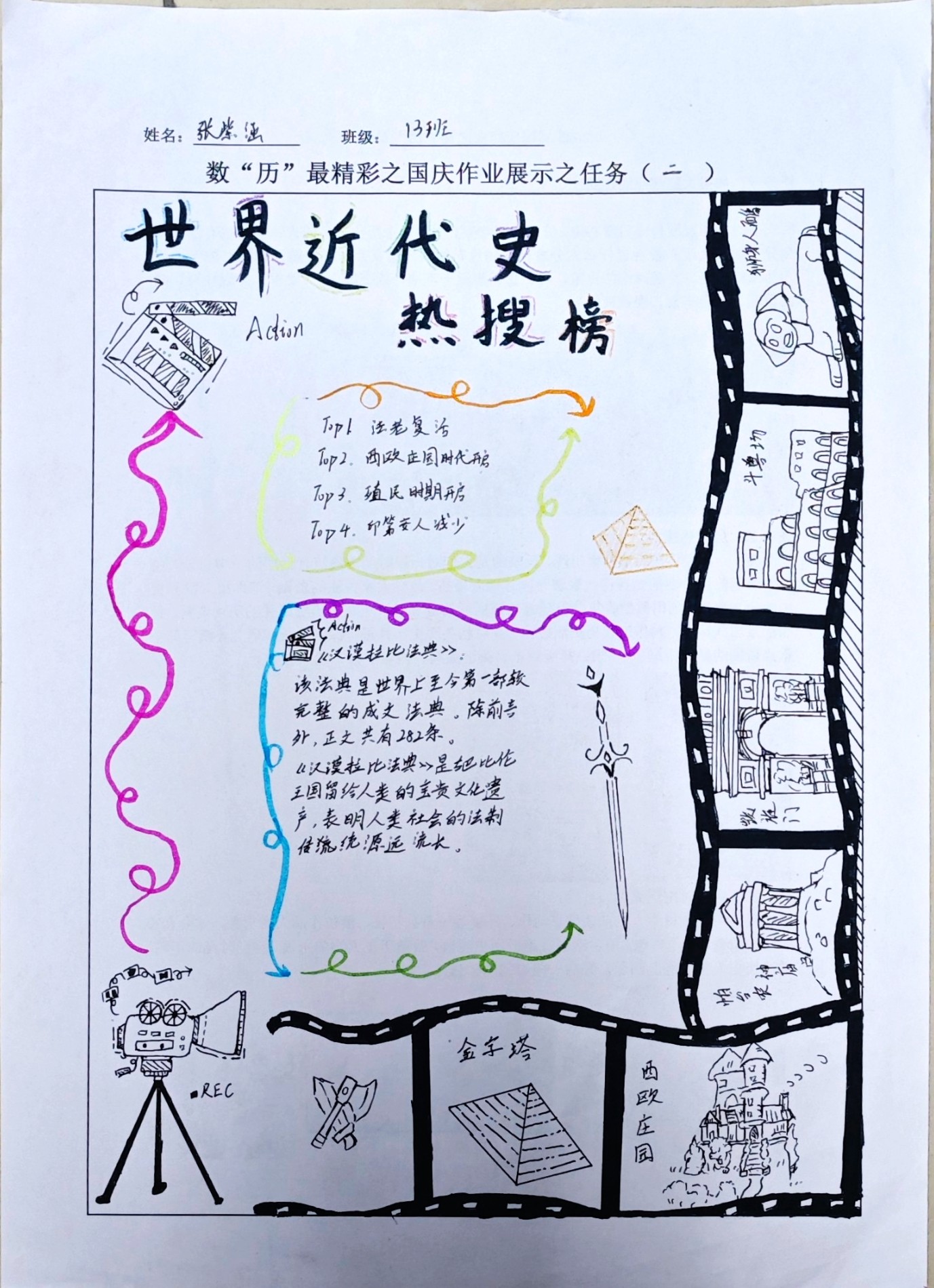 在这些特别的作业项目中,每一位同学都化身为小小历史学家兼艺术家,穿梭于古今,从浩瀚的历史长河中汲取灵感,将那些或辉煌、或悲壮的历史瞬间,巧妙融入一张张独一无二的A4纸中。有的作品描摹了波澜壮阔的历史事件,用细腻的笔触勾勒出历史长河中的风风雨雨,让我们感受世事的沧桑变化;有的则聚焦于璀璨的文明遗迹,通过精美的图案和文字注解,让我们仿佛穿越时空,亲眼见证那些灿烂文明的辉煌与衰落;也有作品以历史人物为主题,浮现出一个又一个鲜活的面孔,让我们从微观的个体视角感受历史的深邃。