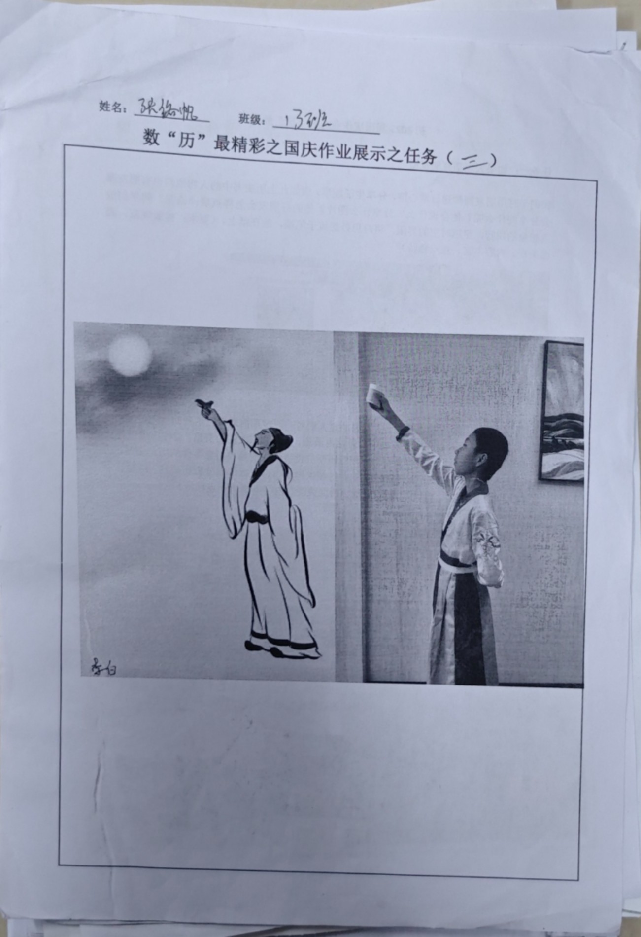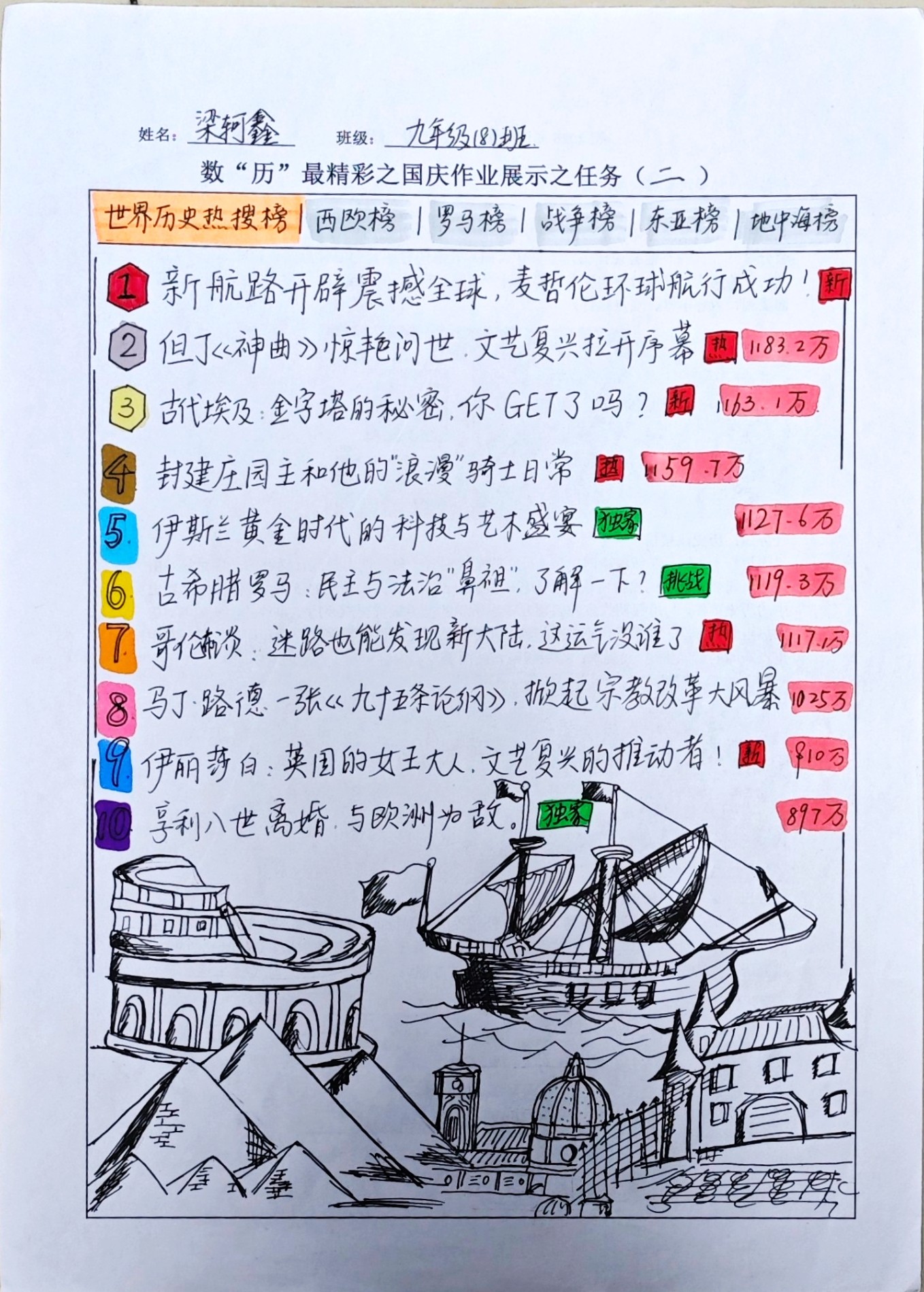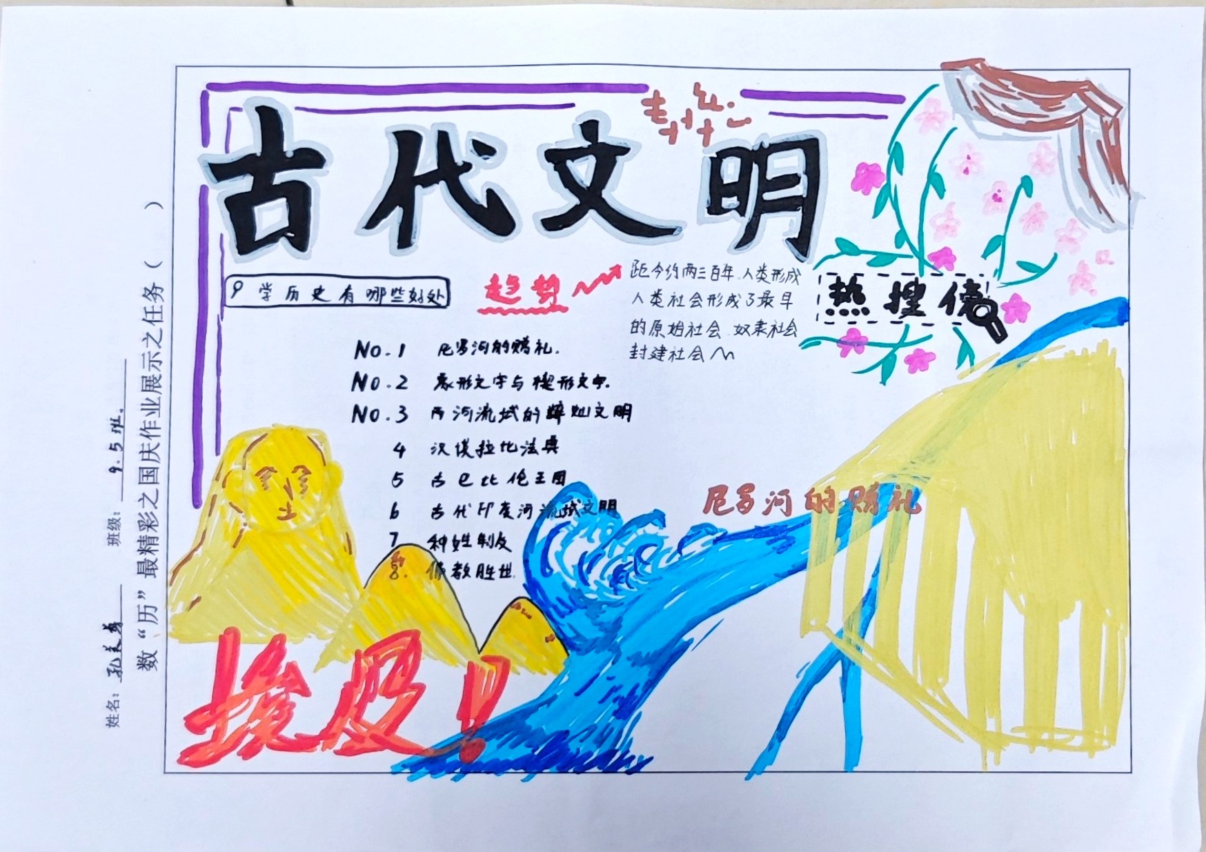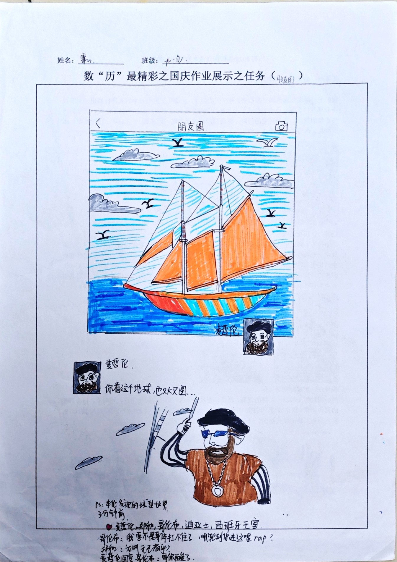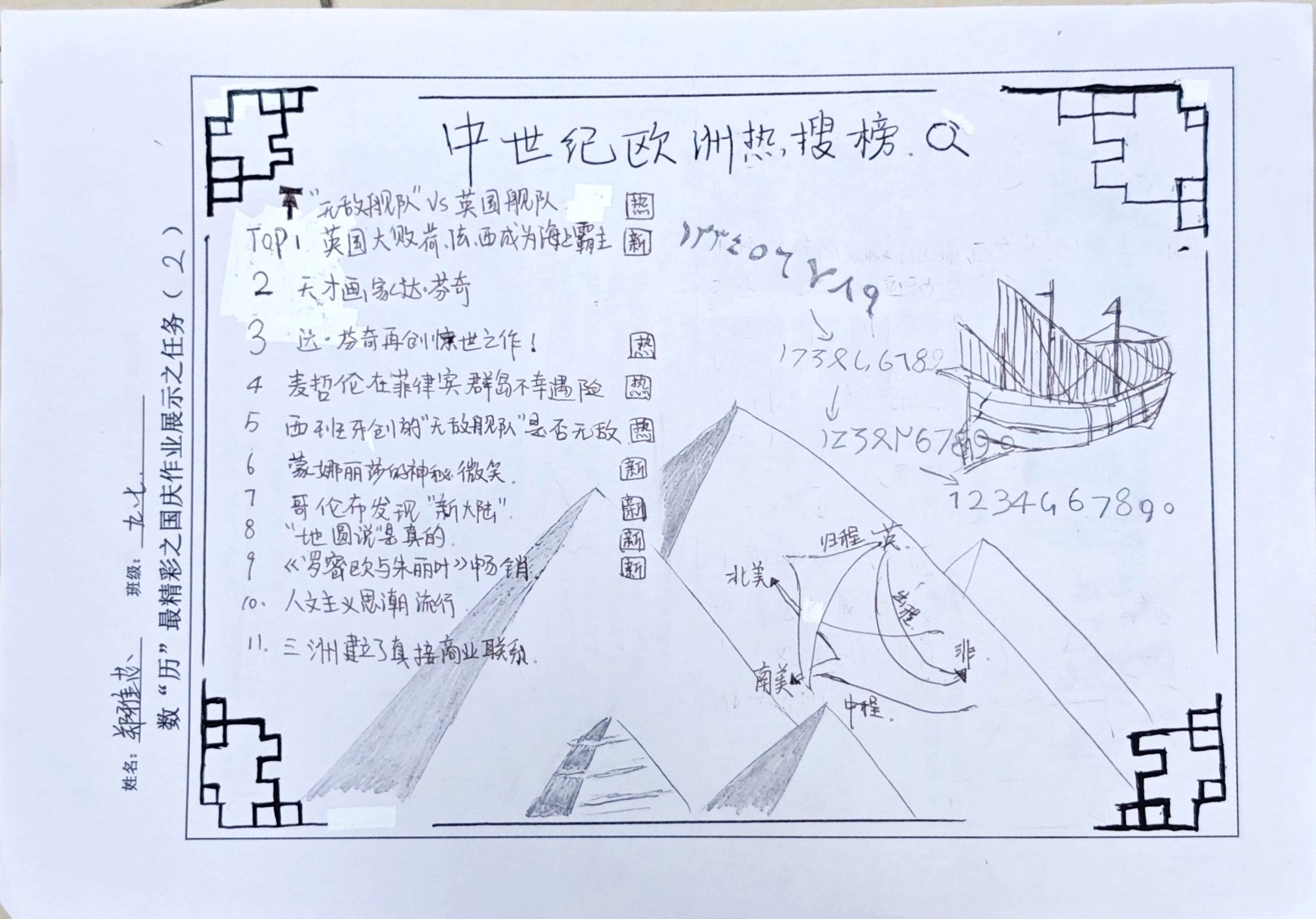 在这些特别的作业项目中,每一位同学都化身为小小历史学家兼艺术家,穿梭于古今,从浩瀚的历史长河中汲取灵感,将那些或辉煌、或悲壮的历史瞬间,巧妙融入一张张独一无二的A4纸中。有的作品描摹了波澜壮阔的历史事件,用细腻的笔触勾勒出历史长河中的风风雨雨,让我们感受世事的沧桑变化;有的则聚焦于璀璨的文明遗迹,通过精美的图案和文字注解,让我们仿佛穿越时空,亲眼见证那些灿烂文明的辉煌与衰落;也有作品以历史人物为主题,浮现出一个又一个鲜活的面孔,让我们从微观的个体视角感受历史的深邃。