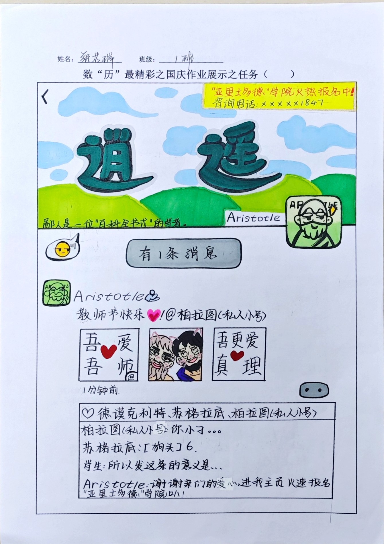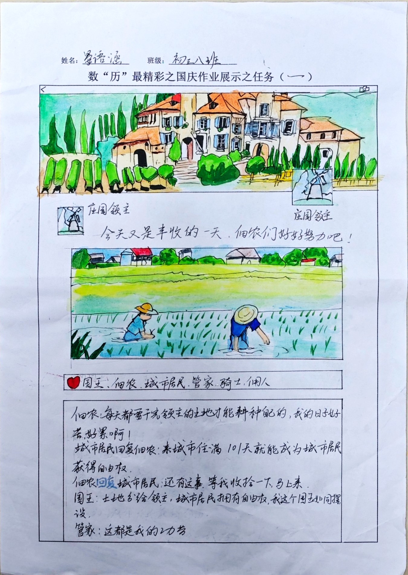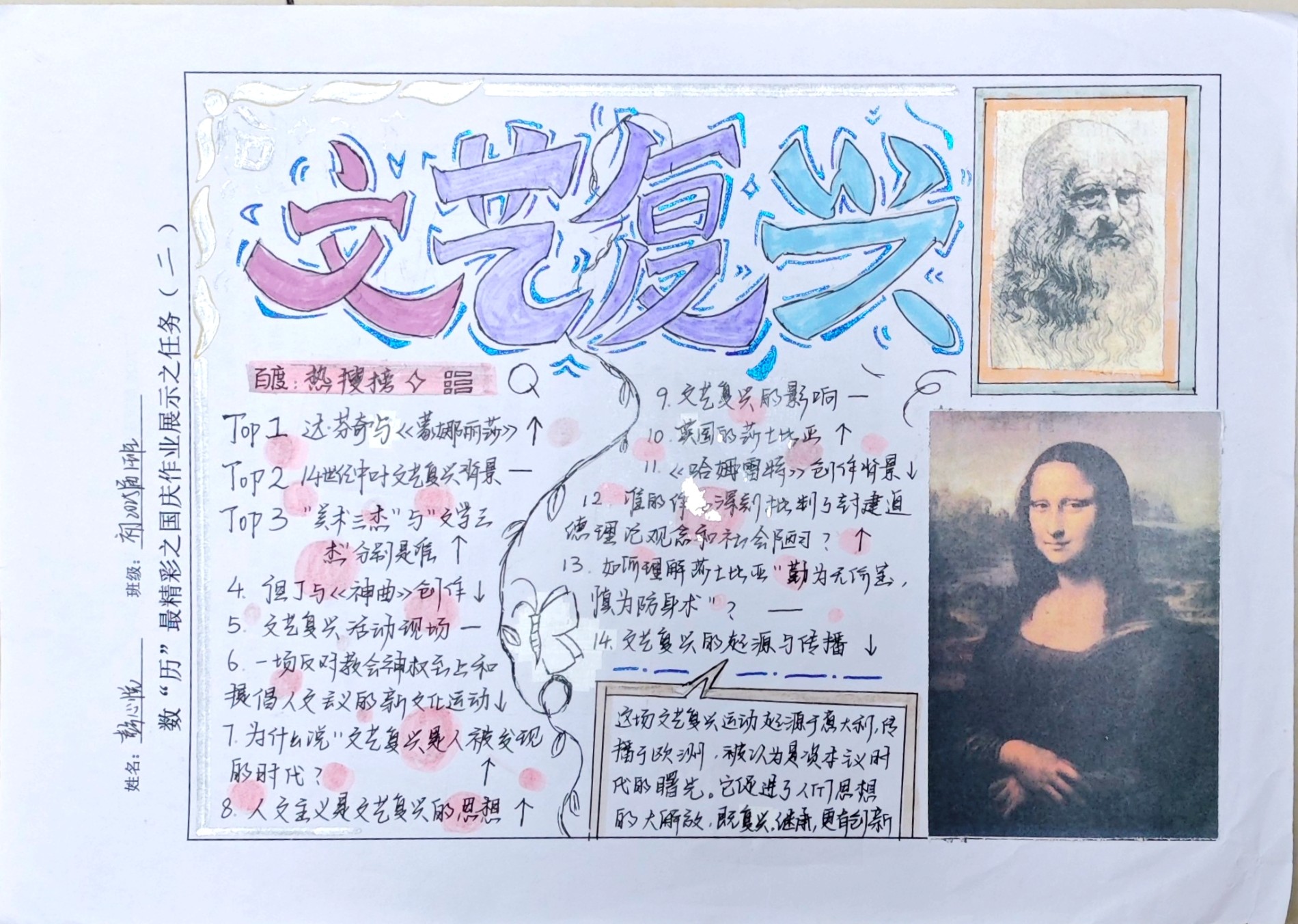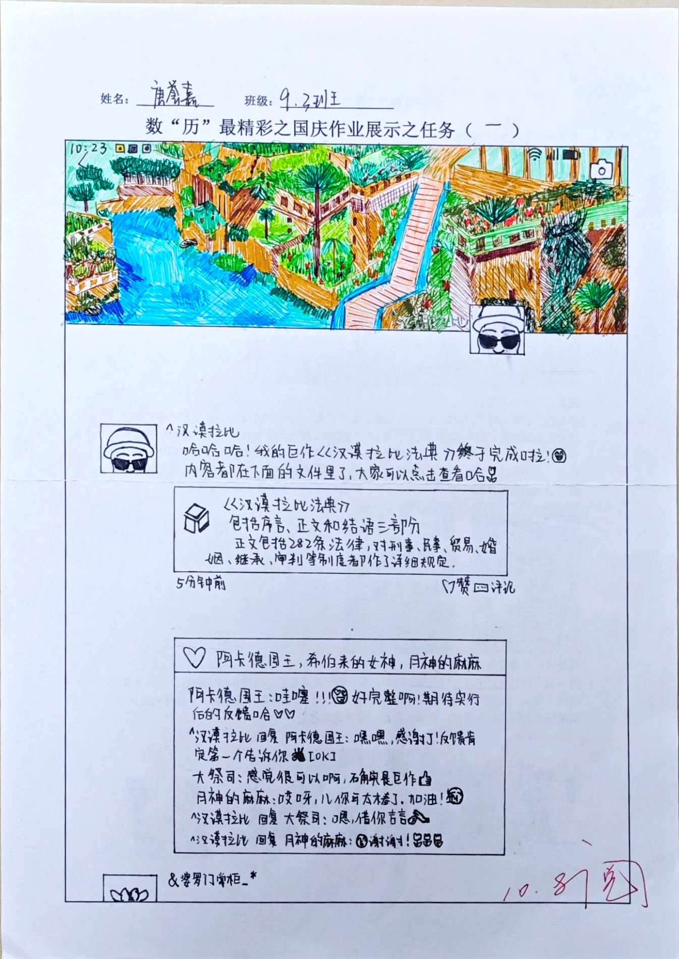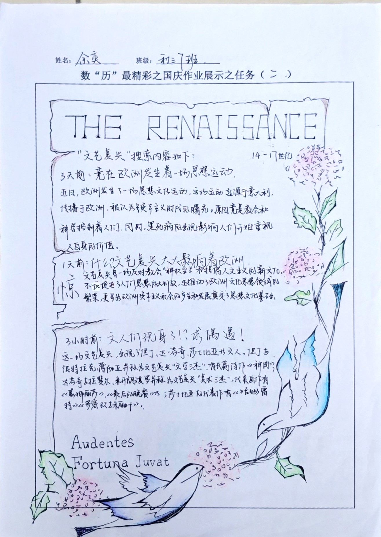 在这些特别的作业项目中,每一位同学都化身为小小历史学家兼艺术家,穿梭于古今,从浩瀚的历史长河中汲取灵感,将那些或辉煌、或悲壮的历史瞬间,巧妙融入一张张独一无二的A4纸中。有的作品描摹了波澜壮阔的历史事件,用细腻的笔触勾勒出历史长河中的风风雨雨,让我们感受世事的沧桑变化;有的则聚焦于璀璨的文明遗迹,通过精美的图案和文字注解,让我们仿佛穿越时空,亲眼见证那些灿烂文明的辉煌与衰落;也有作品以历史人物为主题,浮现出一个又一个鲜活的面孔,让我们从微观的个体视角感受历史的深邃。