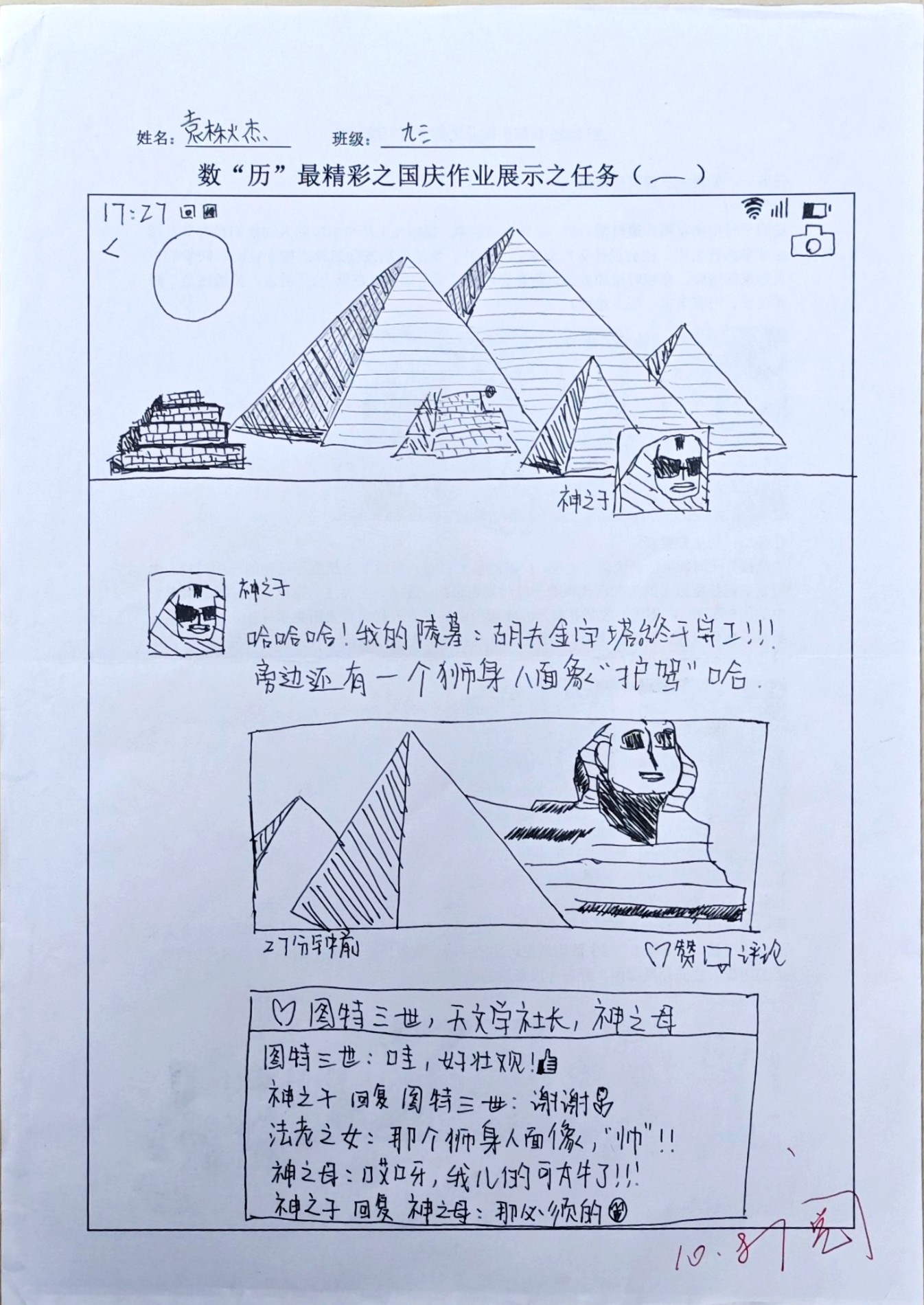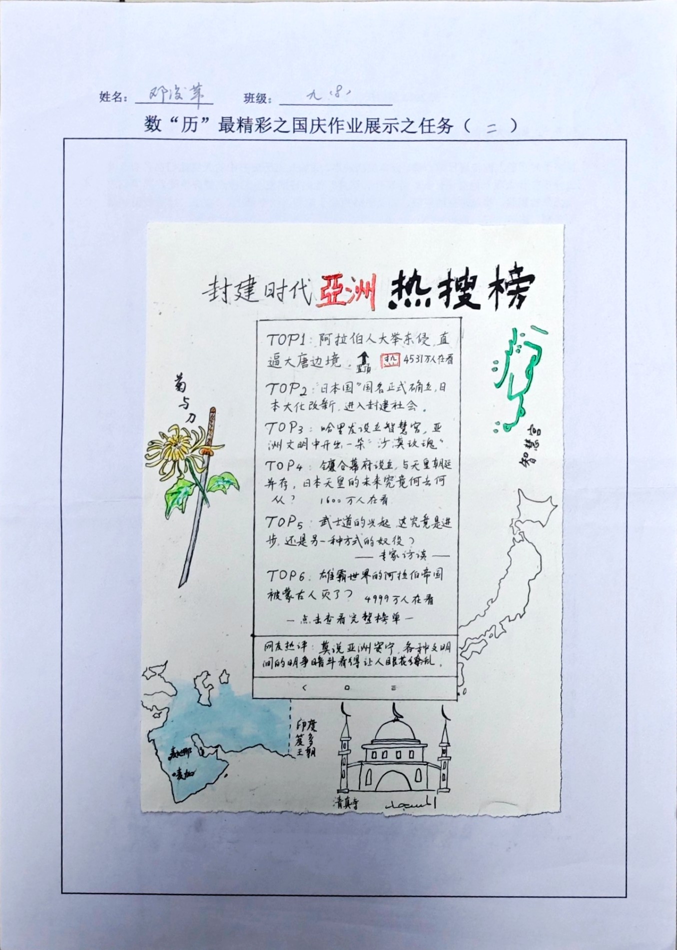 国庆前夕,乐山外国语学校初2025届历史组根据九年级学情,精心设计了一系列具有实践性、创造性和趣味性的创新作业,以同学们喜闻乐见的形式让历史知识鲜活起来,入脑入心,提升学生的历史核心素养,达到“减负提质,减量增效”的教学效果,同时有助于培养学生的实践能力和创新思维,促进学生全面发展。