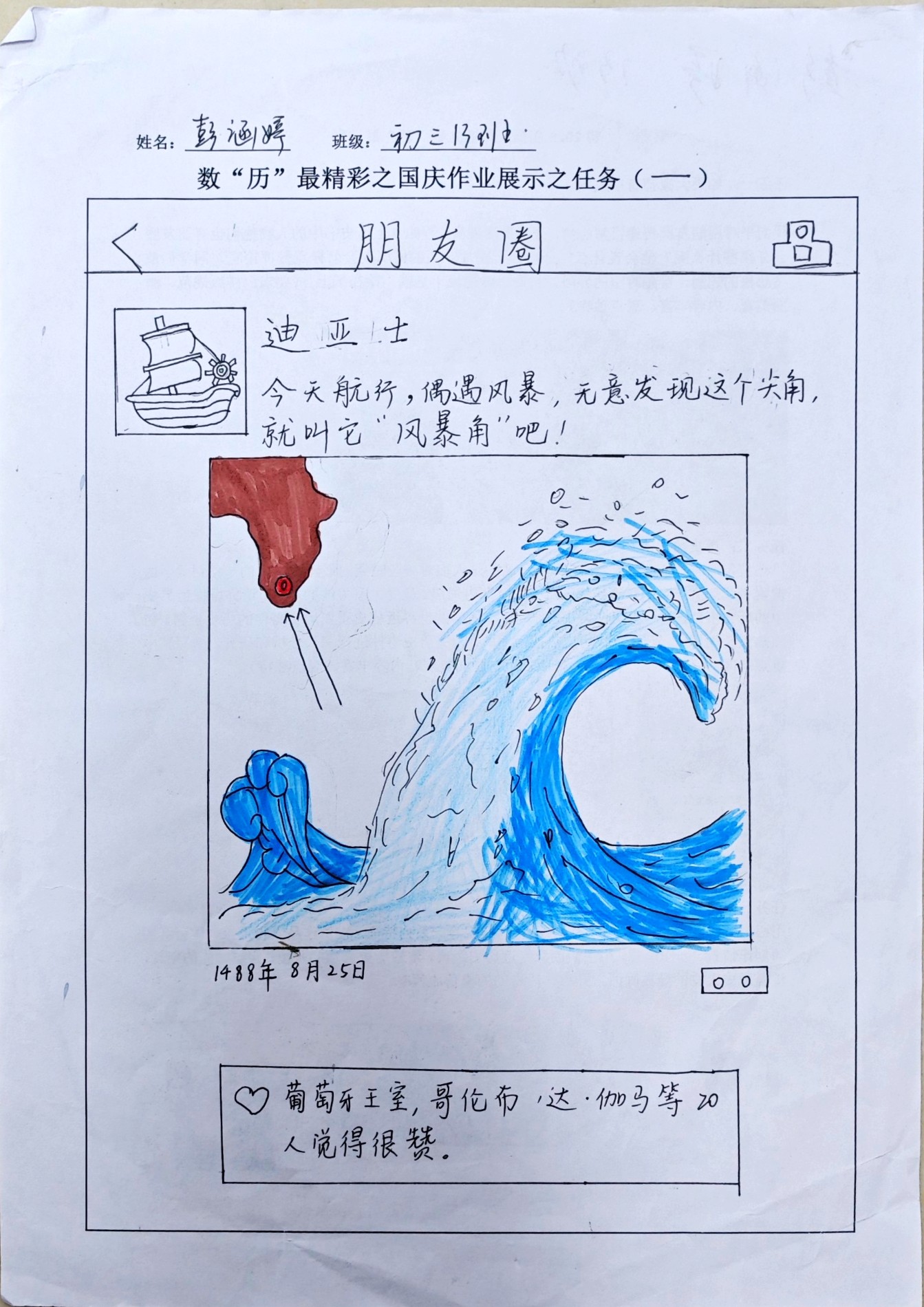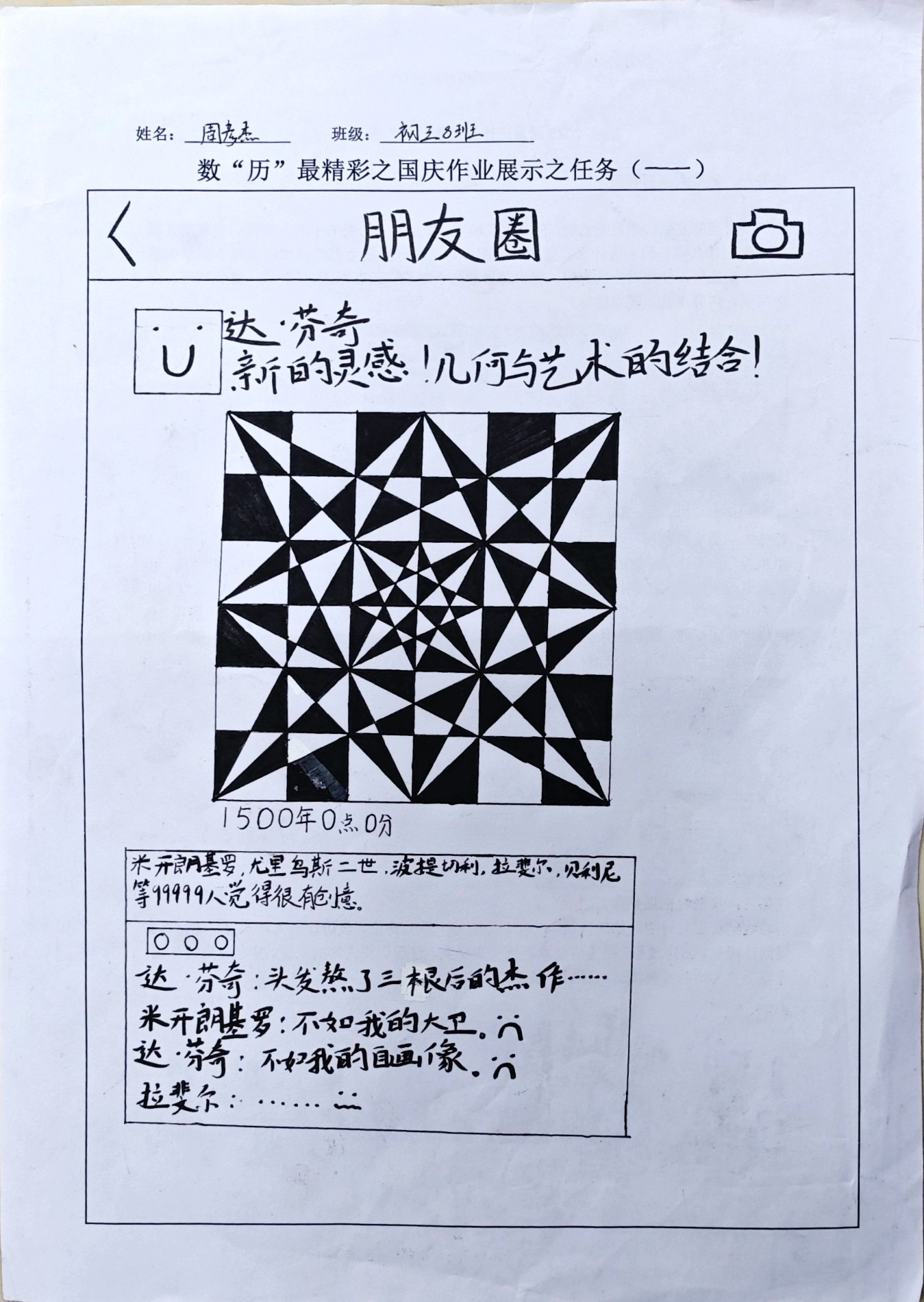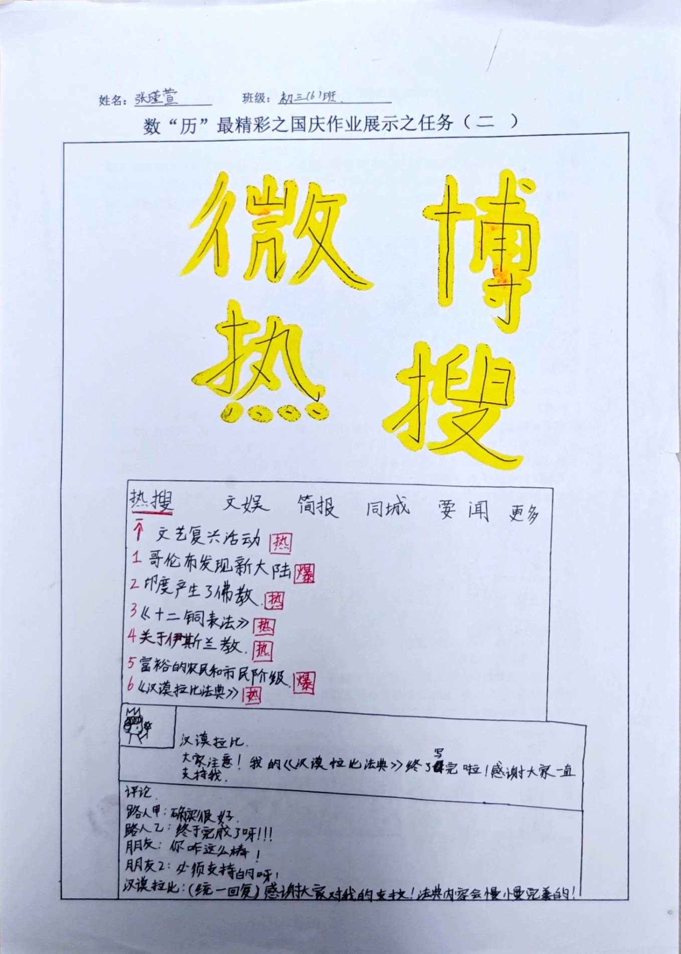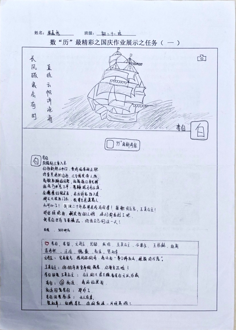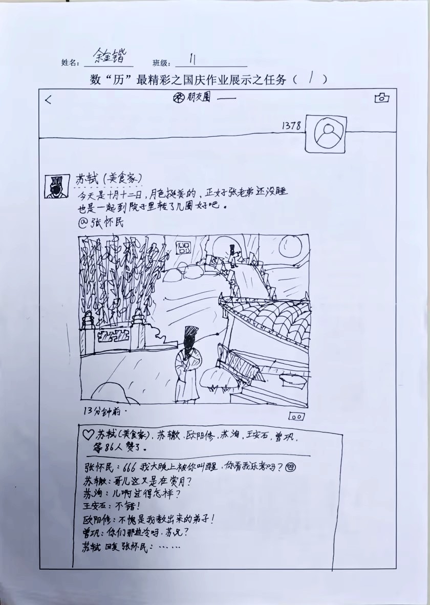 在数“历”最精彩主题作业中,共设置了三项任务。任务一:如果大家都有朋友圈;任务二:历史热搜榜;任务三:穿越时空遇见你。同学们可选择自己感兴趣的任务点找到符合的历史事件或历史人物,用艺术的眼光凝望历史,用创意的笔触描绘过去,无数英雄人物与重大事件交织成一幅幅壮丽的历史画作。
