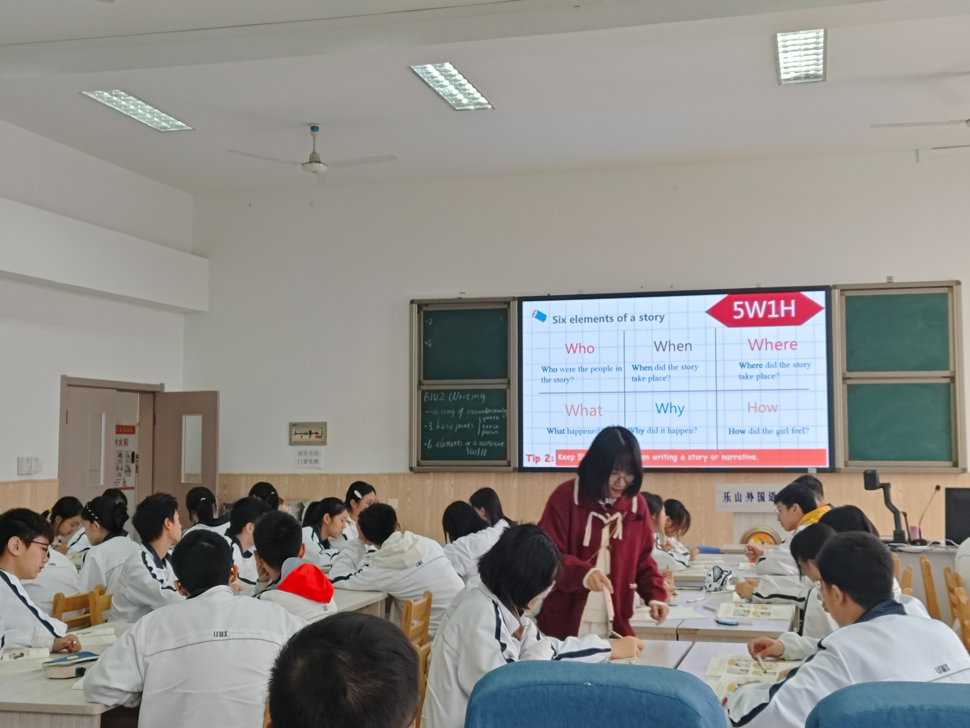 易慧静老师带来的是一节记叙文的写作课。她从审题分析入手,逐步引导学生掌握记叙文的六要素,这种教学方法让学生能够深入理解故事的构建,也为读后续写做好铺垫。课堂上,学生即时完成作文,并在同学间分享、互评,老师也给出了专业的点评,实现了教-学-评的有机结合。这种互动式学习极大地提高了学生的参与度,让每个人都能积极投入到写作和讨论中。易老师认为教师应该用爱心去呵护学生,真诚相待,在教学中陪伴学生,帮助他们提高学习成绩,使之成为更好的自己。这堂课践行了她的教学理念,风格亲切自然,与学生的互动非常融洽,营造出了一个温馨积极的学习氛围,整体效果较好。