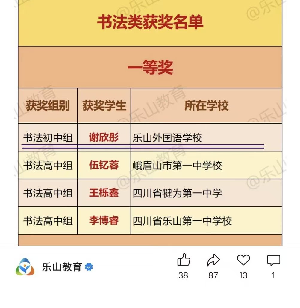 近日,由中共乐山市委宣传部、乐山市教育局、乐山市文化广播电视和旅游局、共青团乐山市委、乐山市文学艺术界联合会主办的乐山市第四届青少年书画传习大会决赛圆满结束。全市11个县(市、区)和乐山高新区近2000余名师生积极参与,我校初三5班谢欣彤 荣获书法类一等奖。