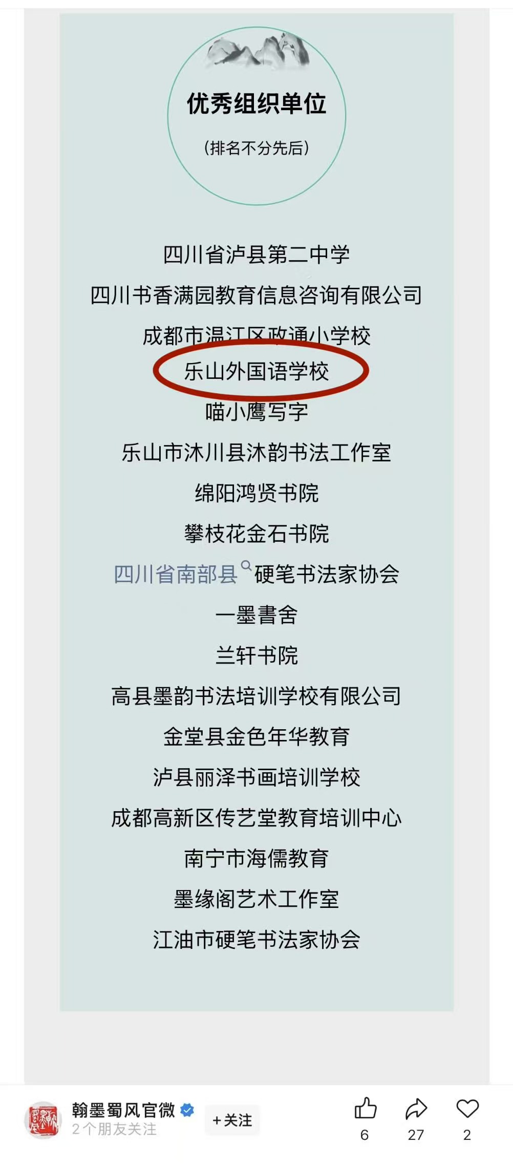 在四川省书法家协会主办的第一届“翰墨蜀风杯“全国硬笔书法大赛中,乐山外国语学校凭借出色的组织工作、优异的整体水平,荣获“优秀组织单位”称号,书法老师杨超荣获“优秀指导教师”称号。
