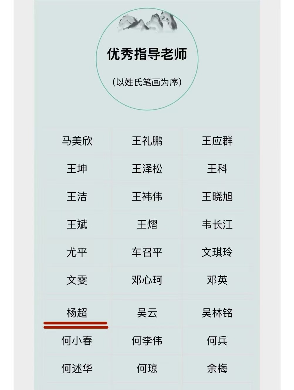 杨超:四川省书法家协会会员、美术家协会会员、乐山市硬笔书法家协会常务理事、乐山市青少年硬笔书法大赛优秀指导教师。组织学生参加2024年第一届芙蓉杯全国硬笔书法大赛,荣获特等奖、金奖、银奖、铜奖若干,同时被评为全国硬笔书法名师。其创作作品在全国各省市进行精品联展,并荣获收藏证书。