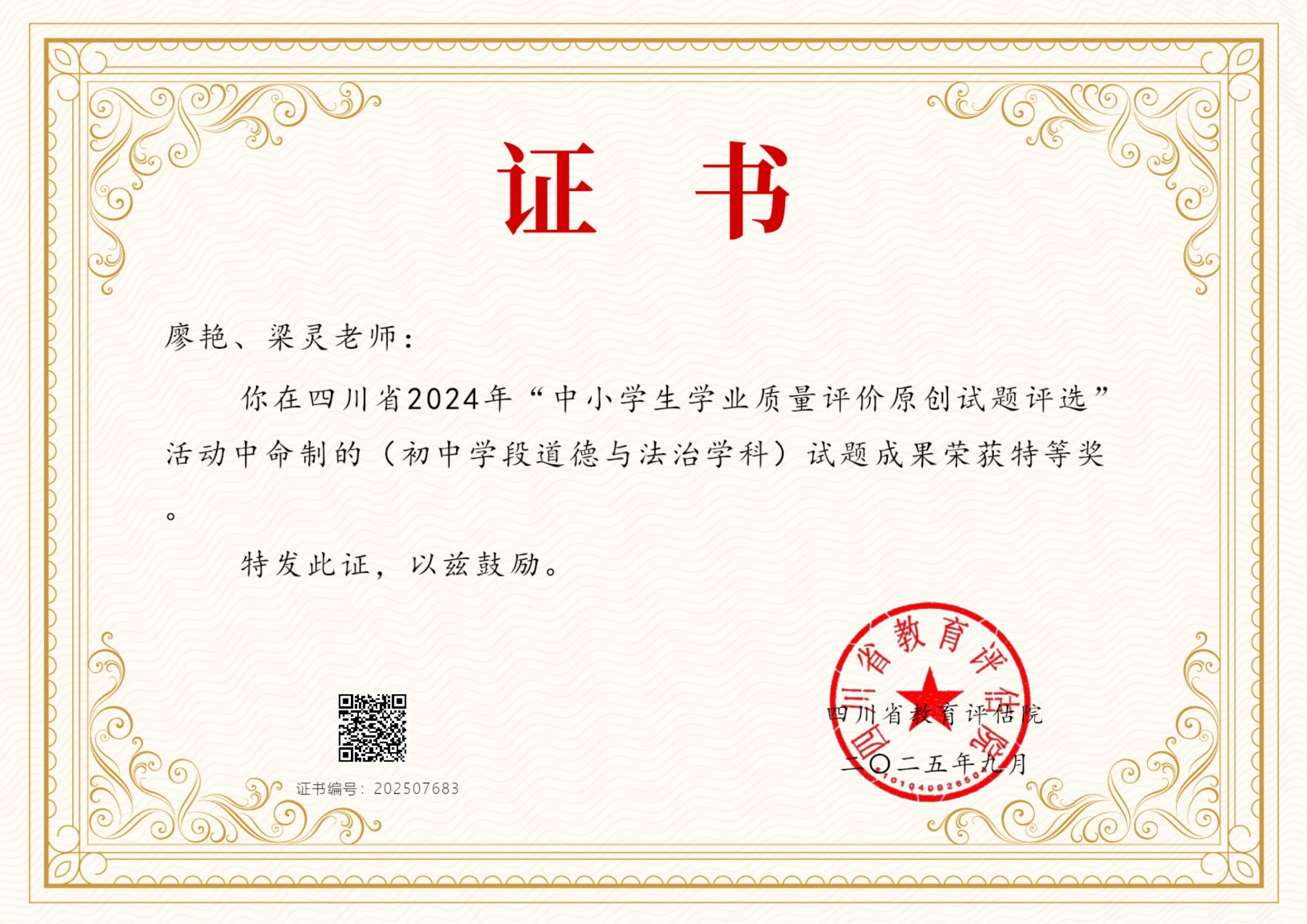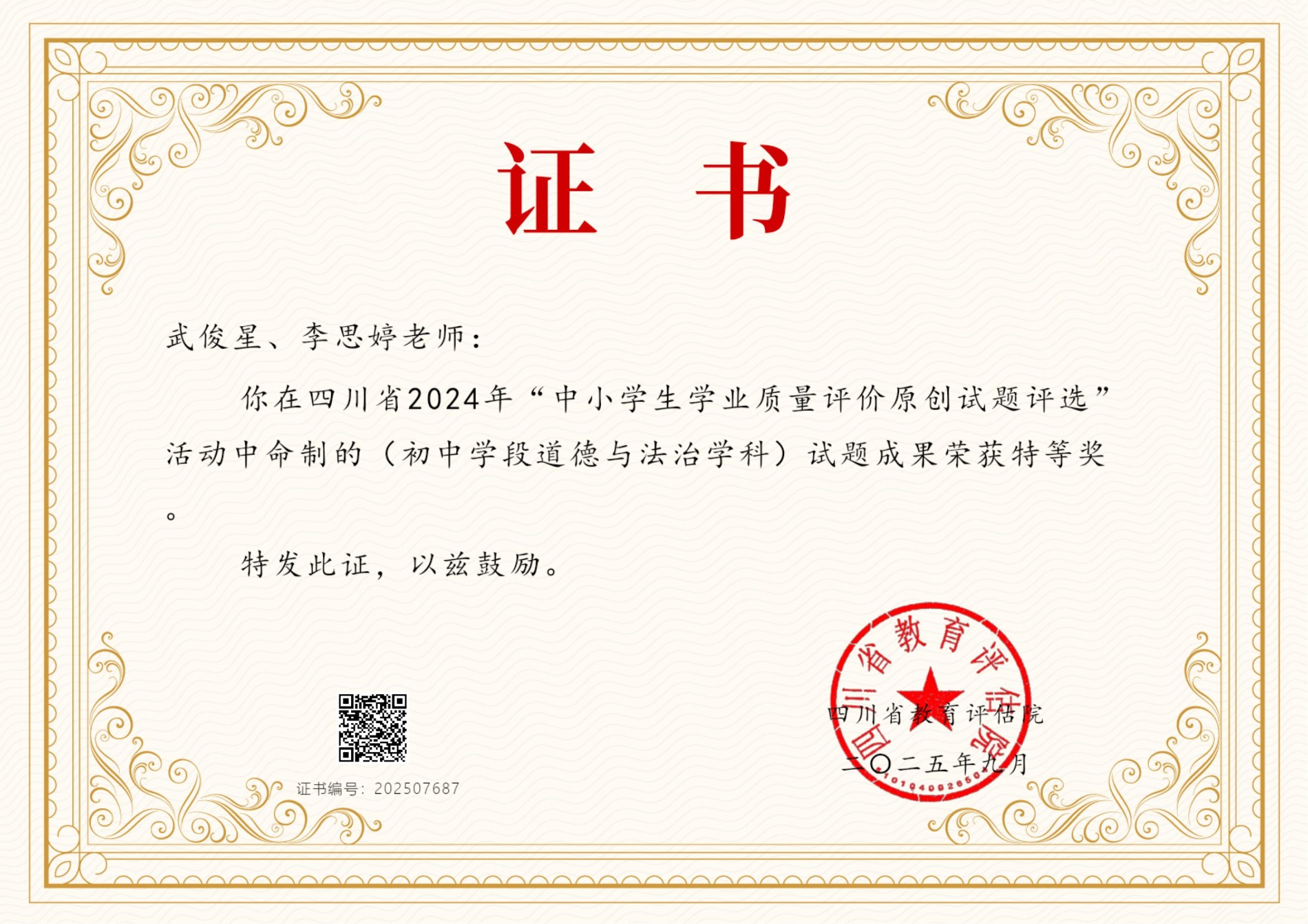 ——热烈祝贺我校道法组四位老师获得2024年度四川省中小学生学业质量评价原创试题评选活动特等奖!