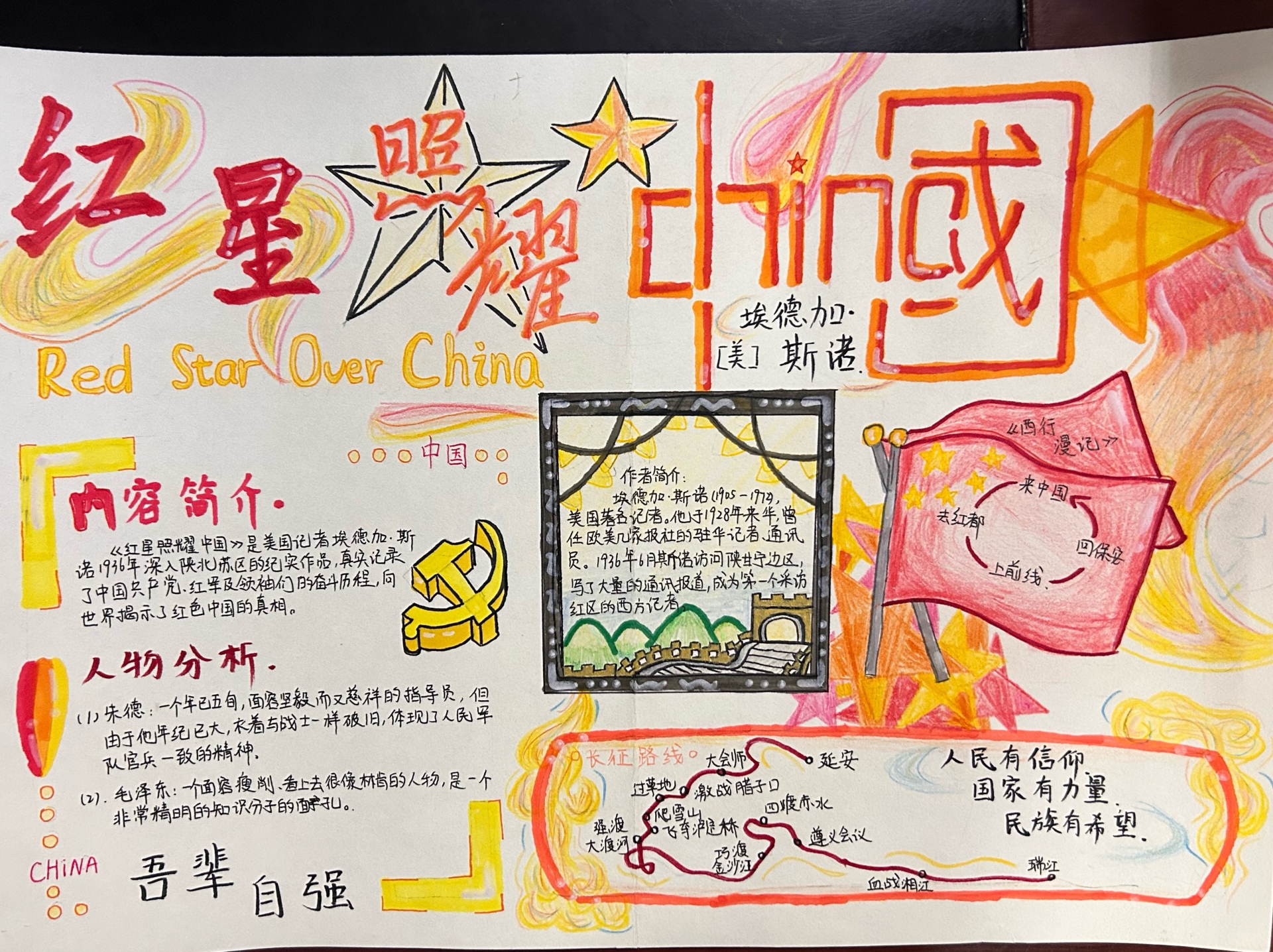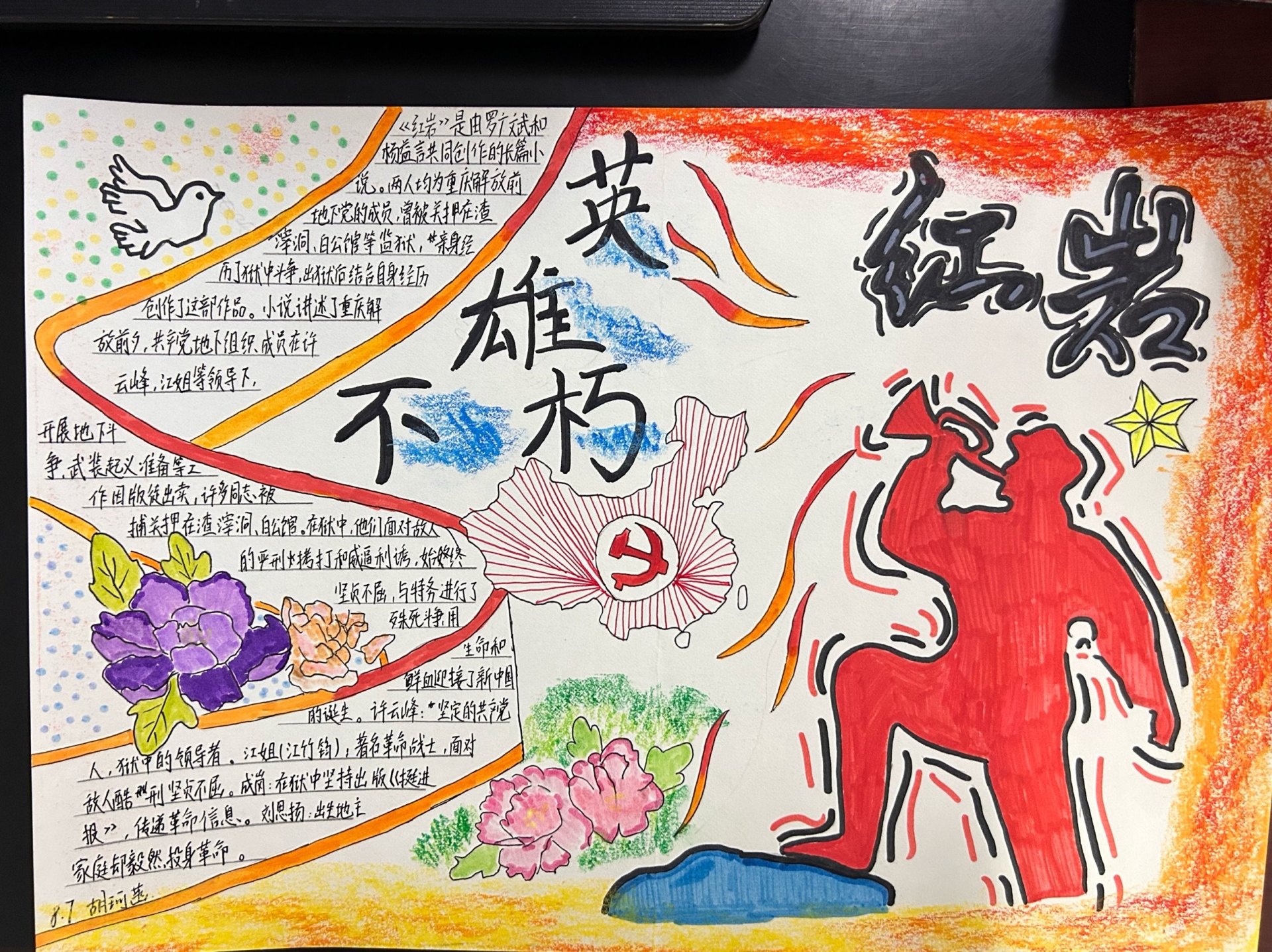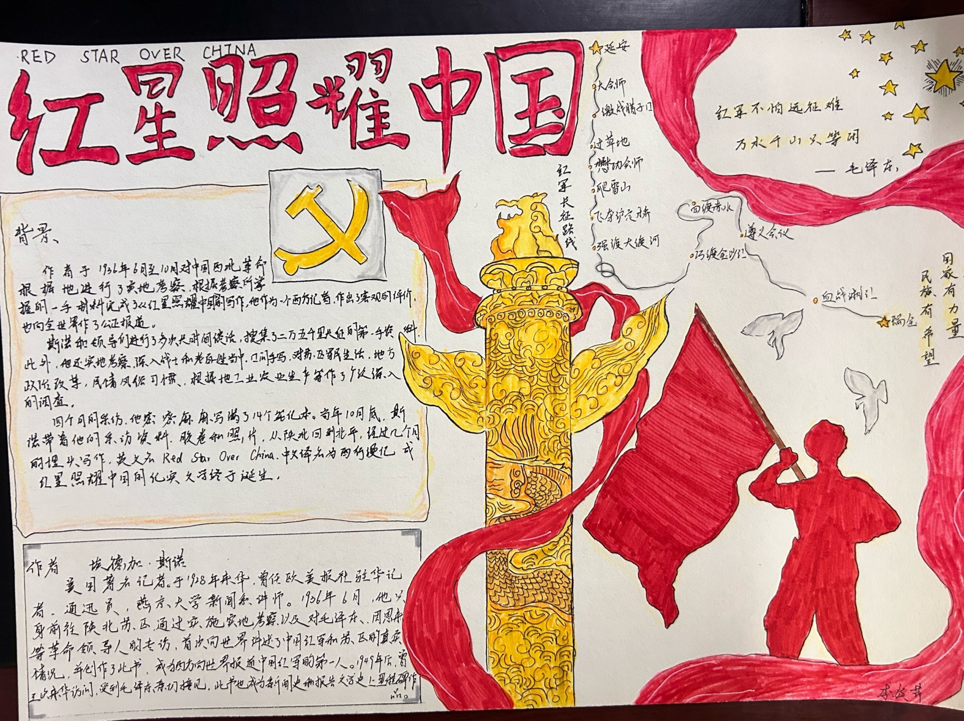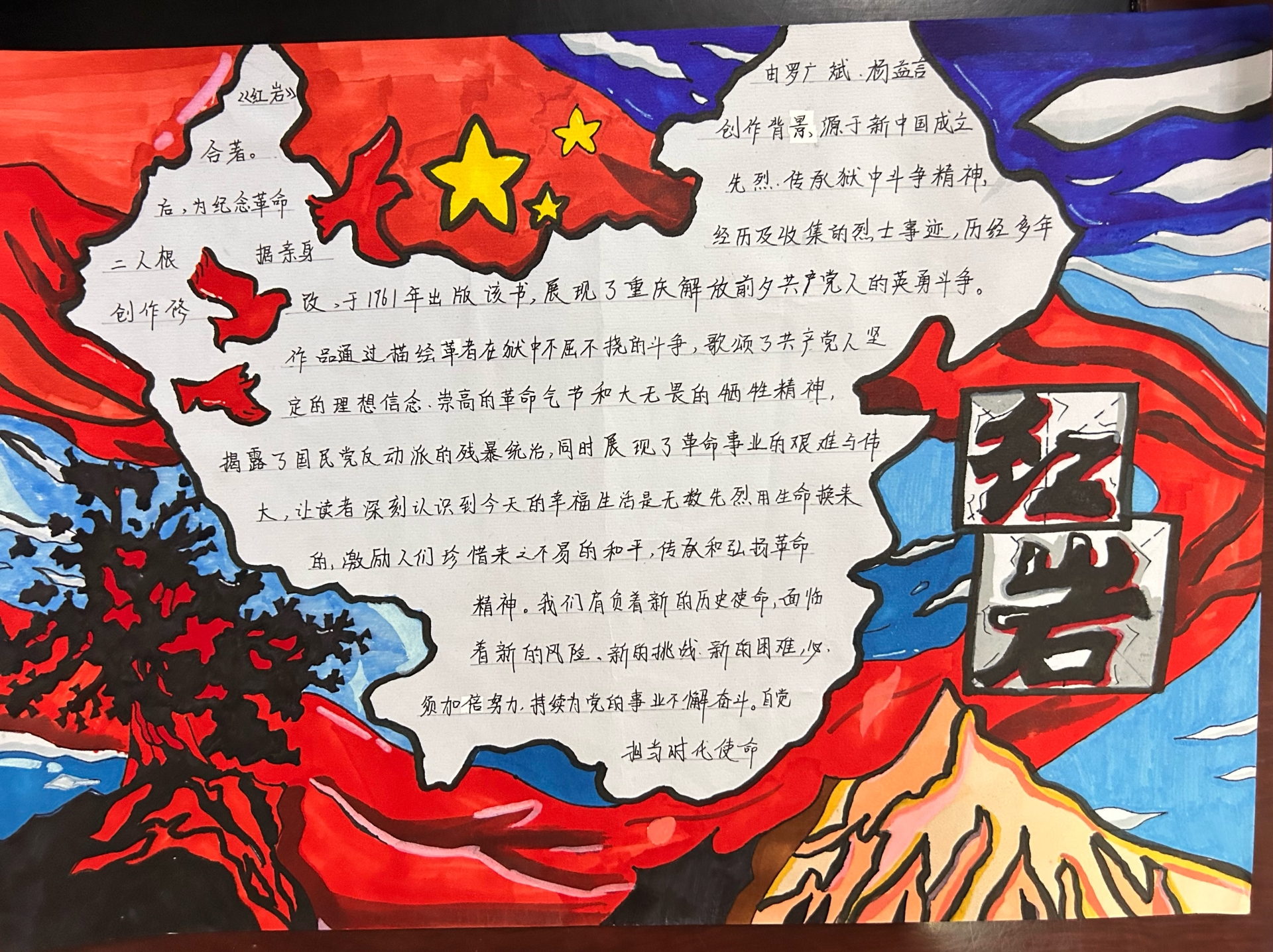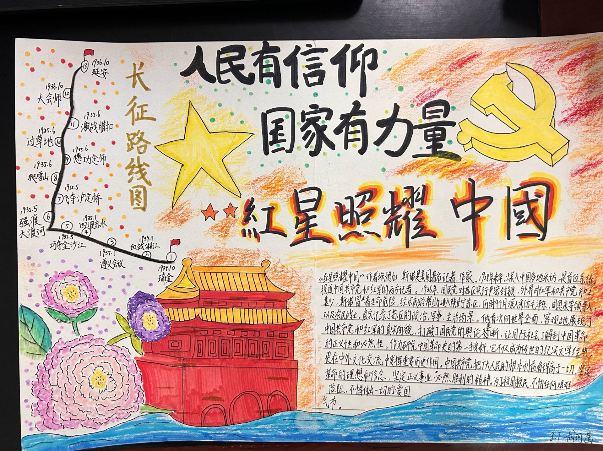 学生们在认真研读《红星照耀中国》《红岩》等经典著作后,满怀热情地投入到了手抄报的创作中。一方小小的画纸,成了他们抒发爱国之情的广阔天地。有的同学用细腻的笔触,画出了红军战士翻越雪山草地的坚毅身影,再现了江姐在狱中绣红旗的动人场景;有的同学则用工整的字迹,认真摘录了书中的经典段落,并写下了自己真挚的读后感言。“我看到了信仰的力量”“今天的幸福生活来之不易”,一句句稚嫩却坚定的话语,是孩子们与历史对话后最真诚的回响。
