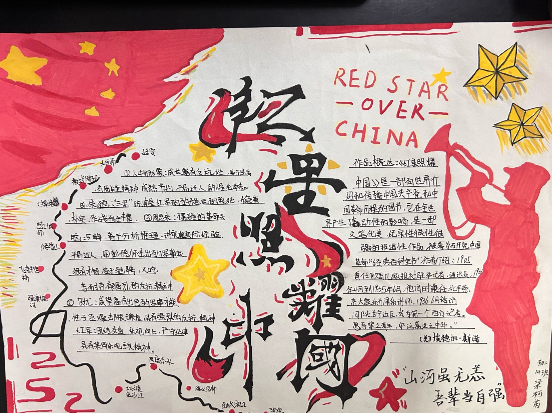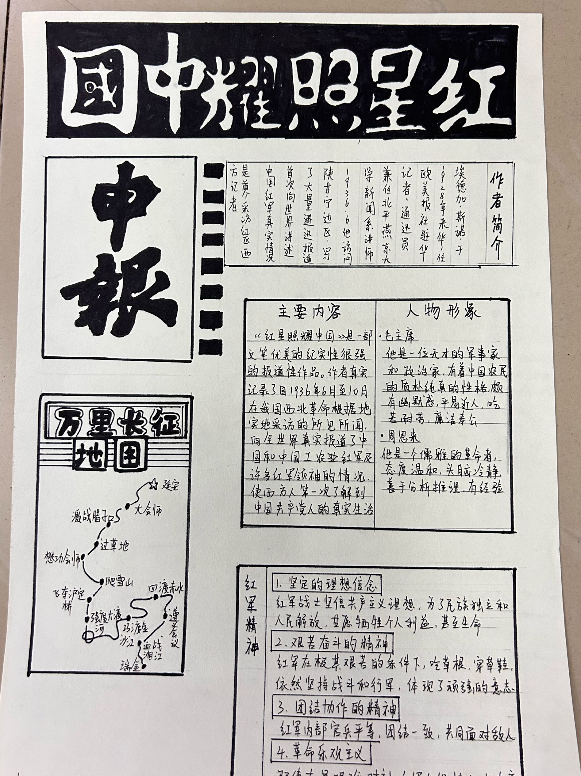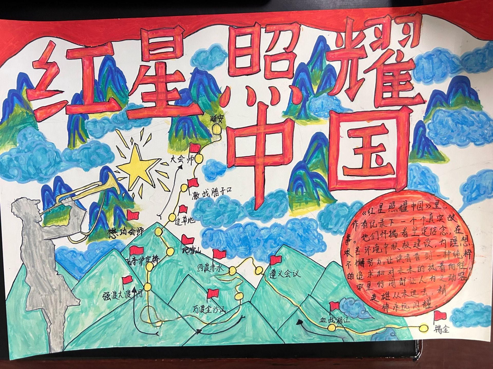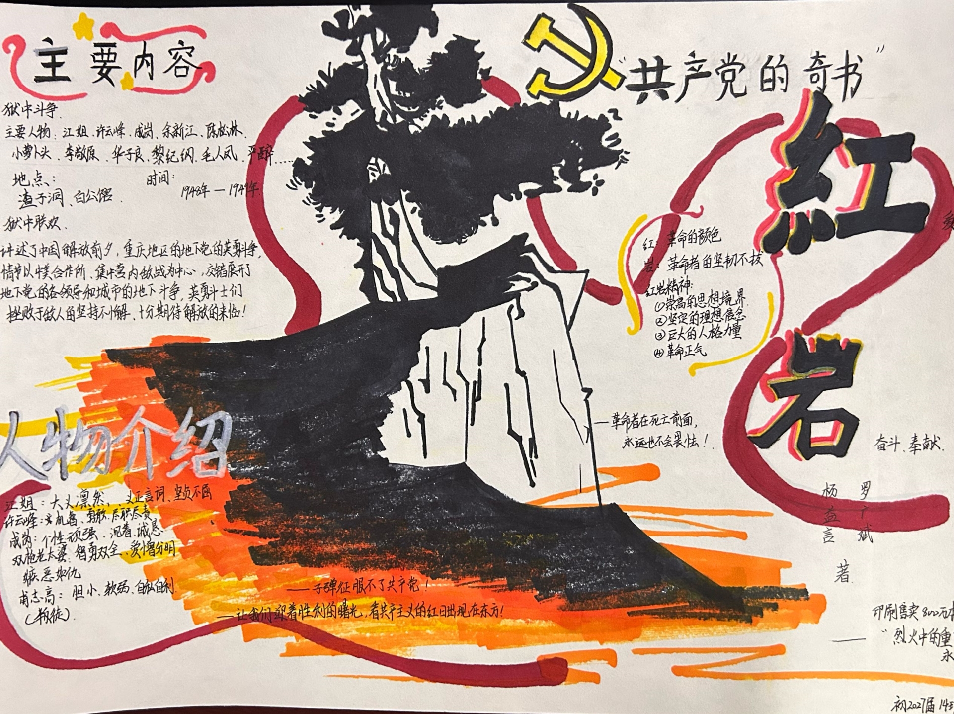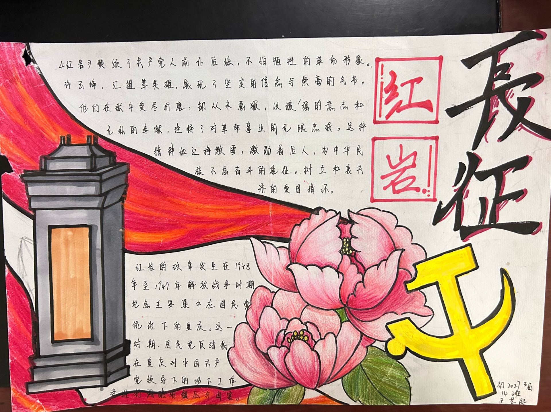学生们在认真研读《红星照耀中国》《红岩》等经典著作后,满怀热情地投入到了手抄报的创作中。一方小小的画纸,成了他们抒发爱国之情的广阔天地。有的同学用细腻的笔触,画出了红军战士翻越雪山草地的坚毅身影,再现了江姐在狱中绣红旗的动人场景;有的同学则用工整的字迹,认真摘录了书中的经典段落,并写下了自己真挚的读后感言。“我看到了信仰的力量”“今天的幸福生活来之不易”,一句句稚嫩却坚定的话语,是孩子们与历史对话后最真诚的回响。