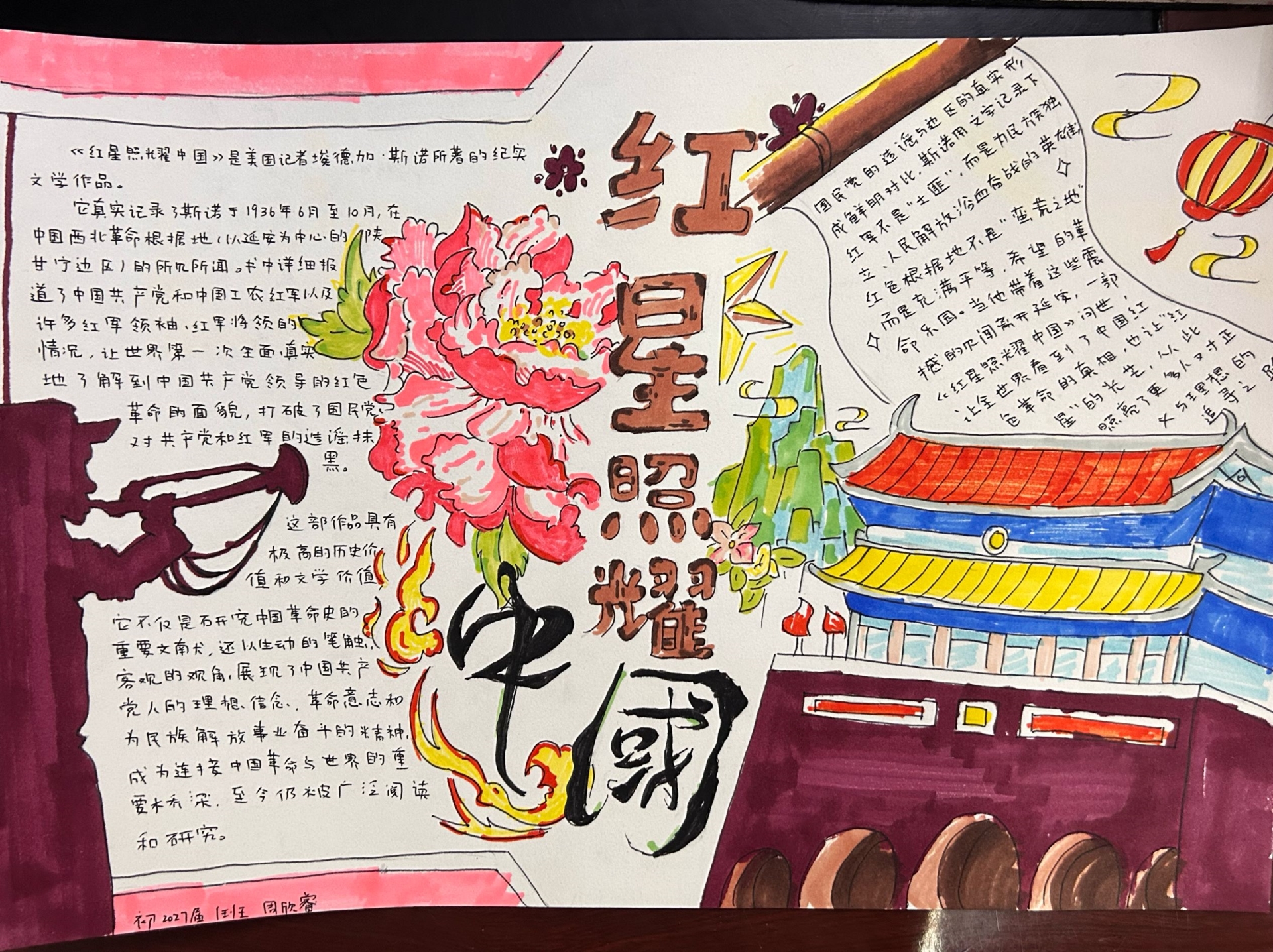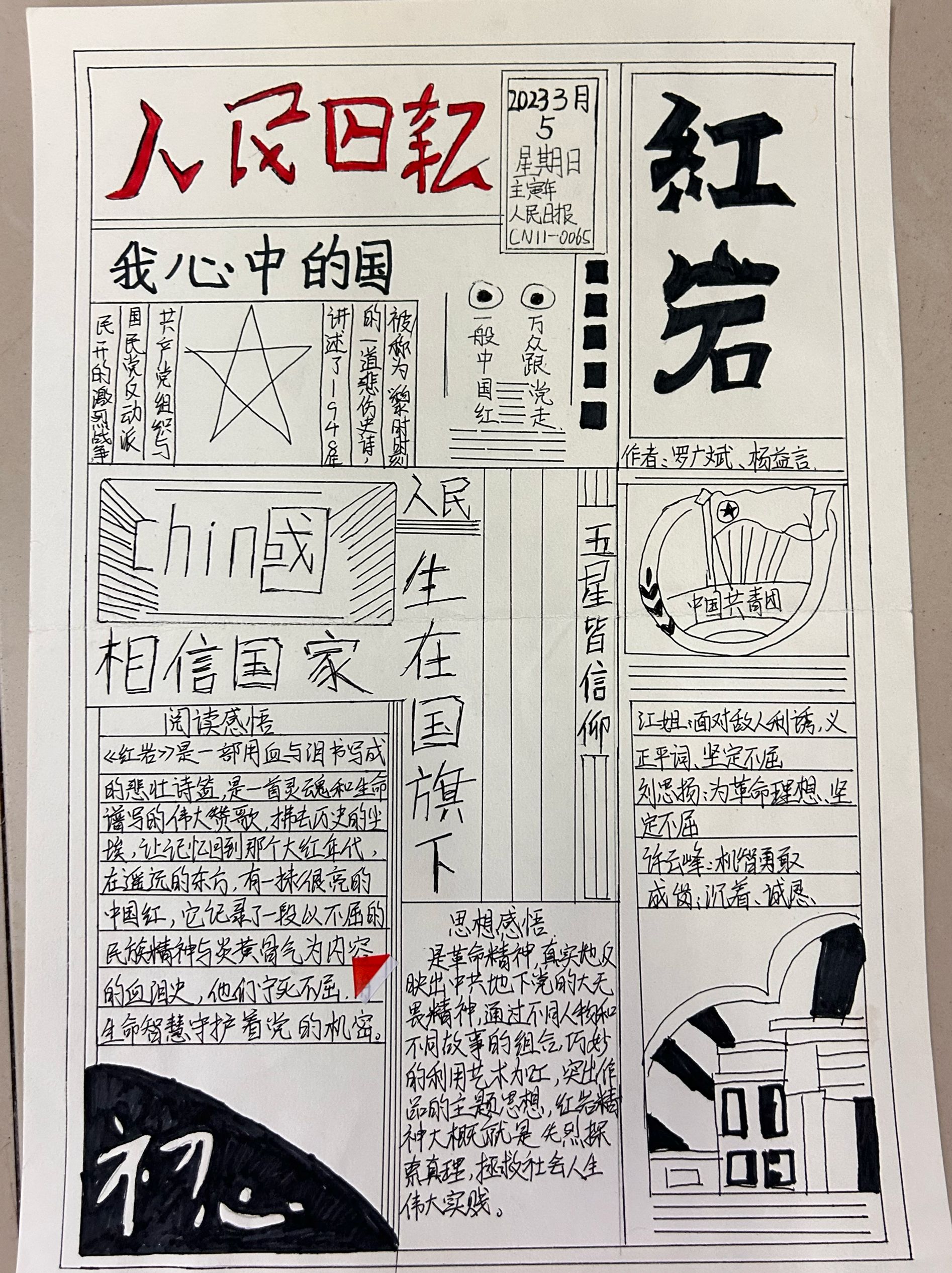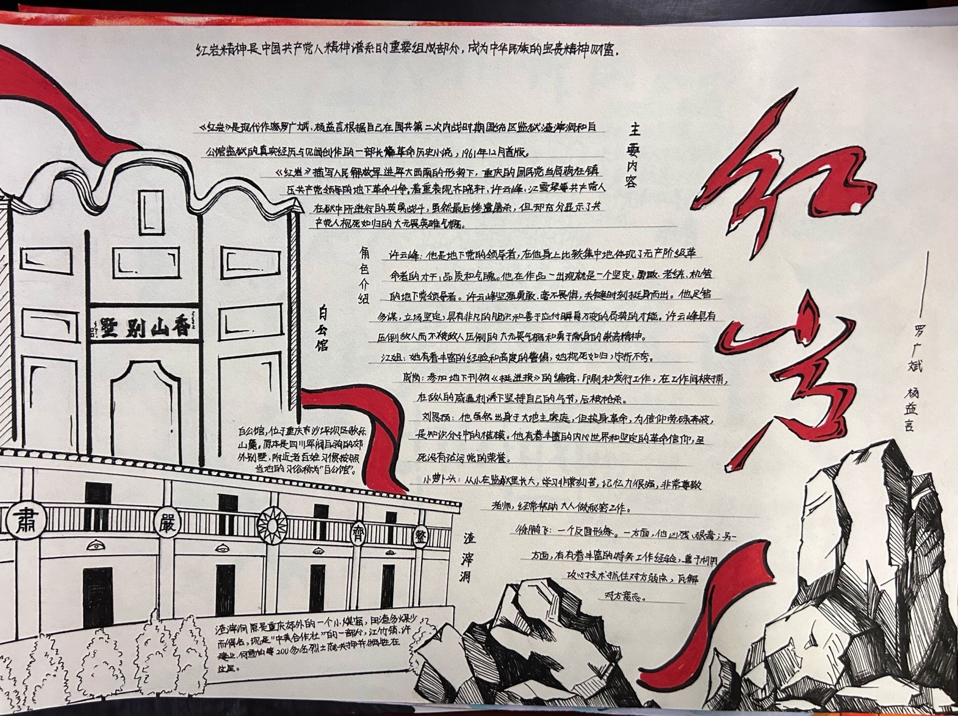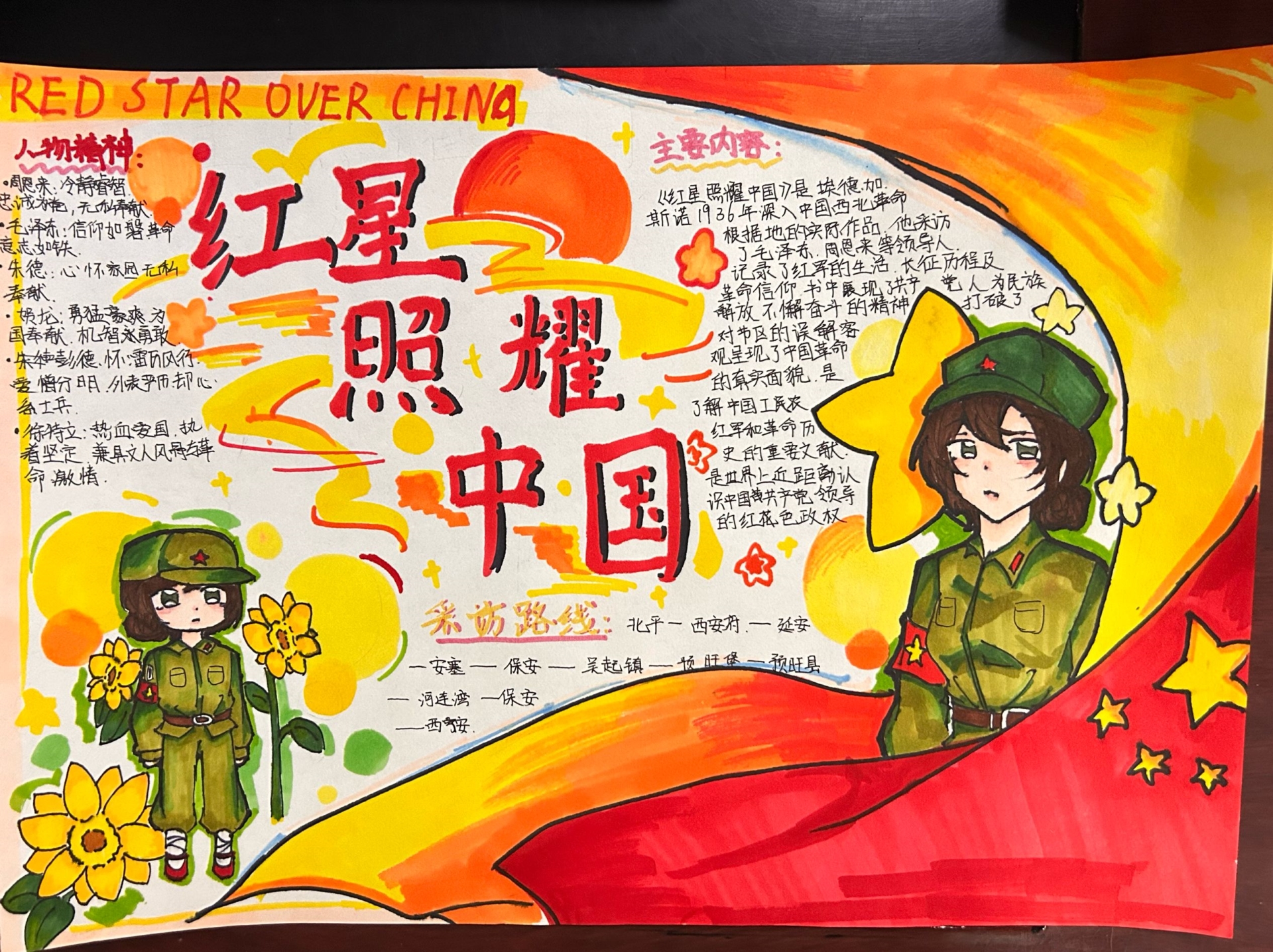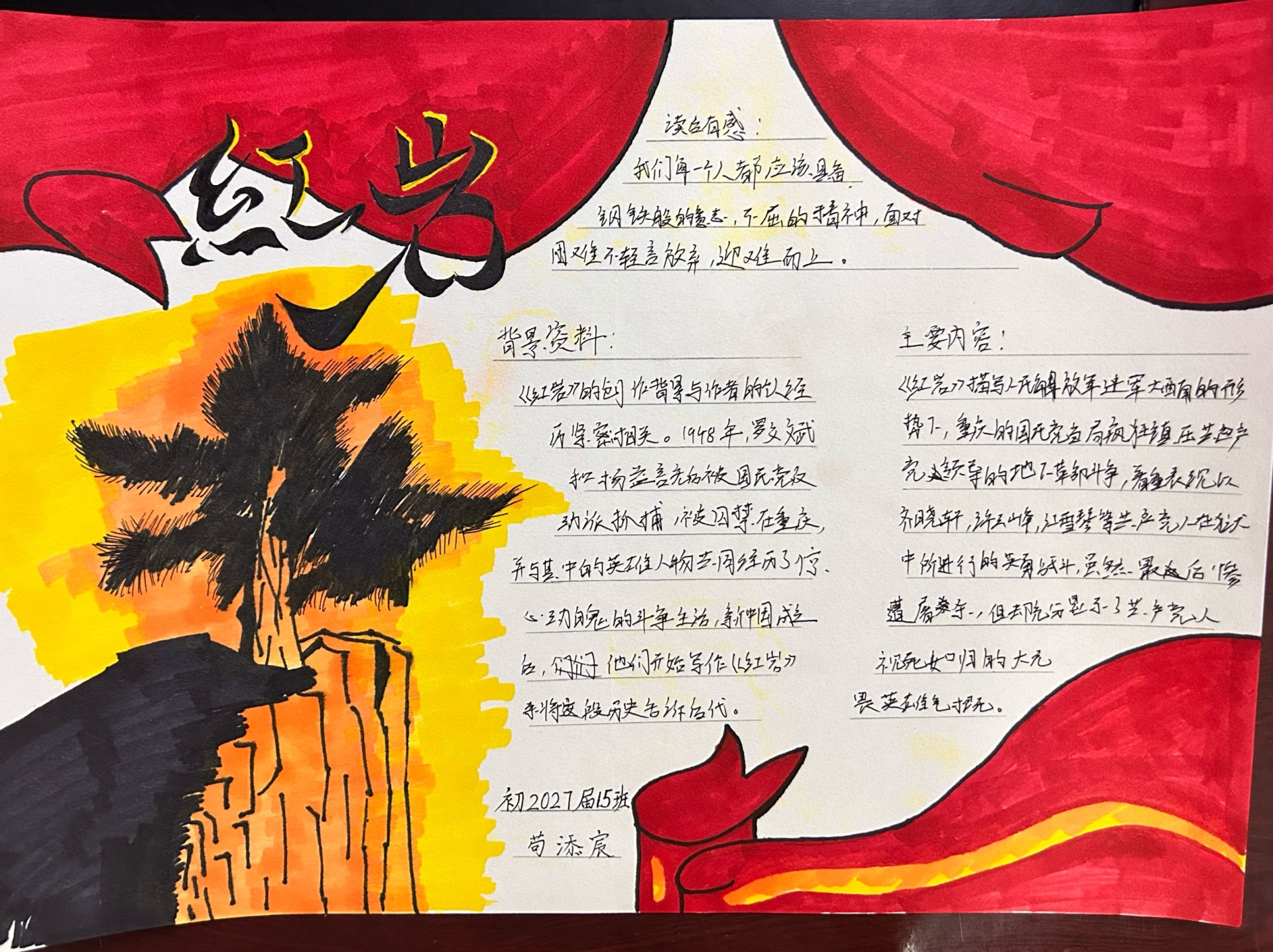 学生们在认真研读《红星照耀中国》《红岩》等经典著作后,满怀热情地投入到了手抄报的创作中。一方小小的画纸,成了他们抒发爱国之情的广阔天地。有的同学用细腻的笔触,画出了红军战士翻越雪山草地的坚毅身影,再现了江姐在狱中绣红旗的动人场景;有的同学则用工整的字迹,认真摘录了书中的经典段落,并写下了自己真挚的读后感言。“我看到了信仰的力量”“今天的幸福生活来之不易”,一句句稚嫩却坚定的话语,是孩子们与历史对话后最真诚的回响。