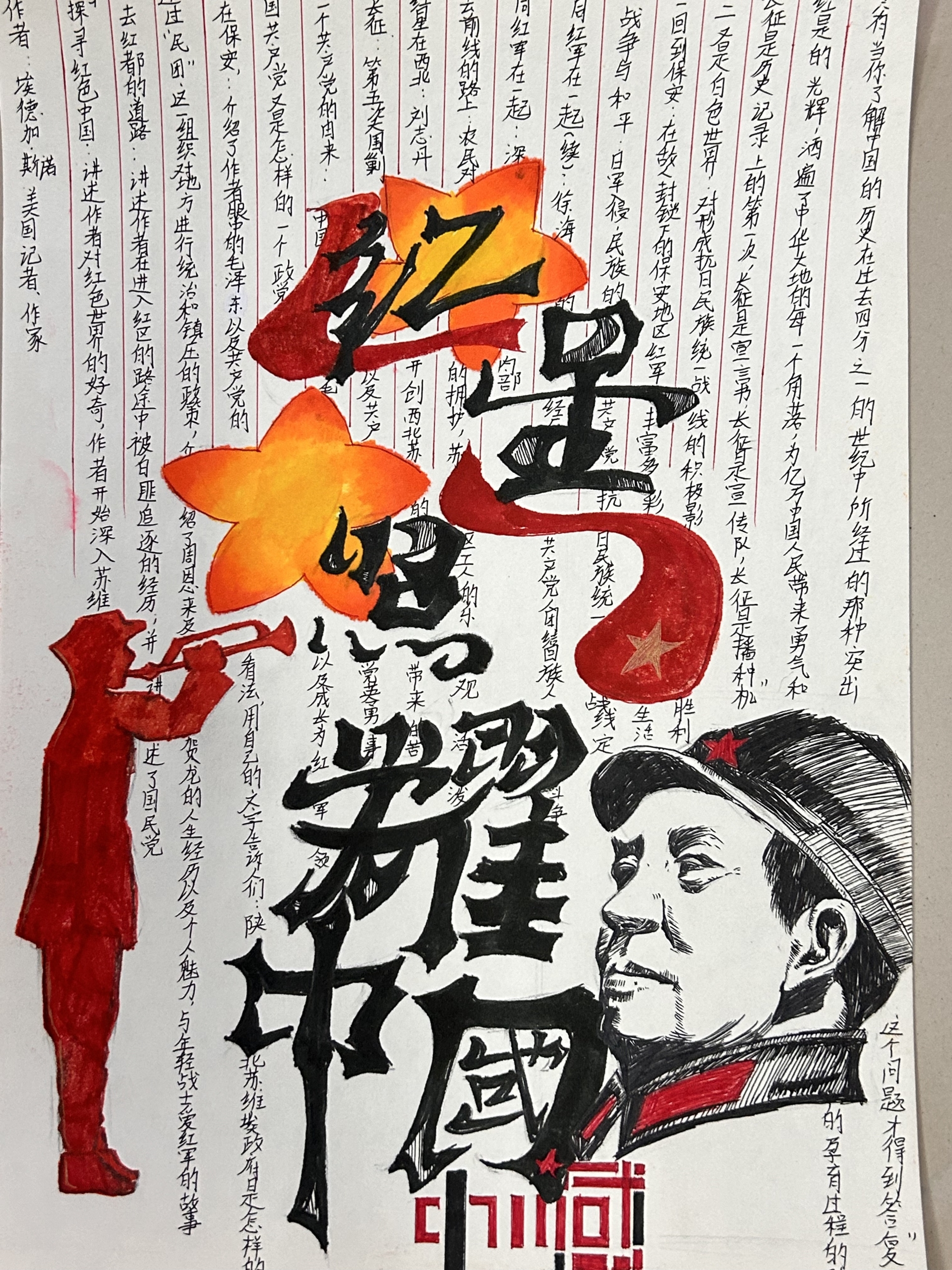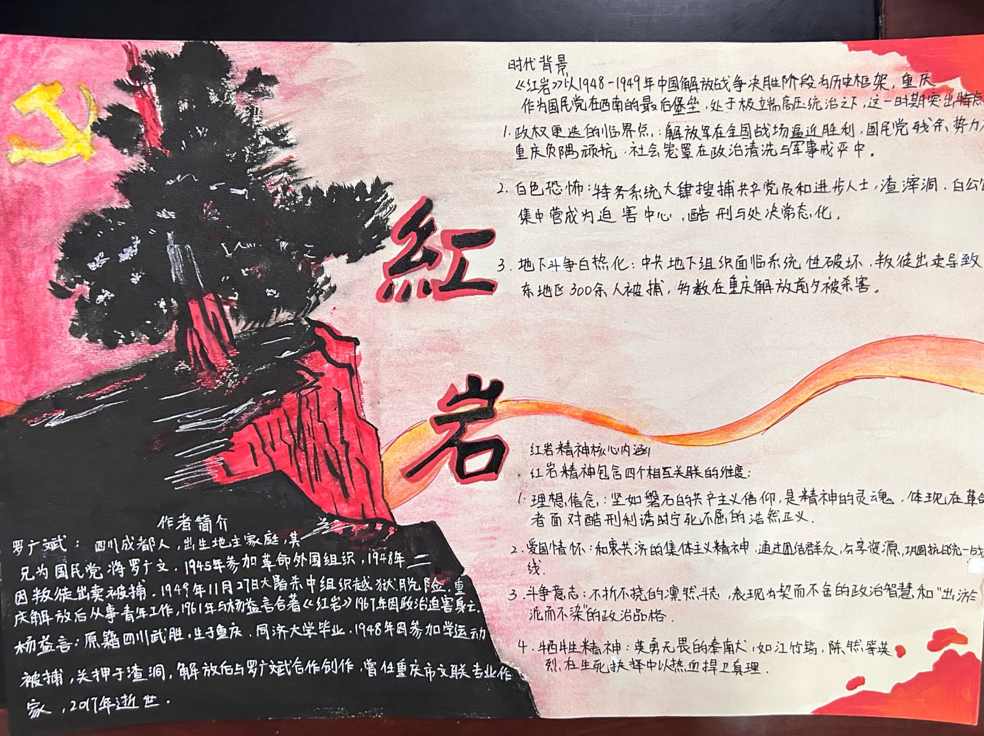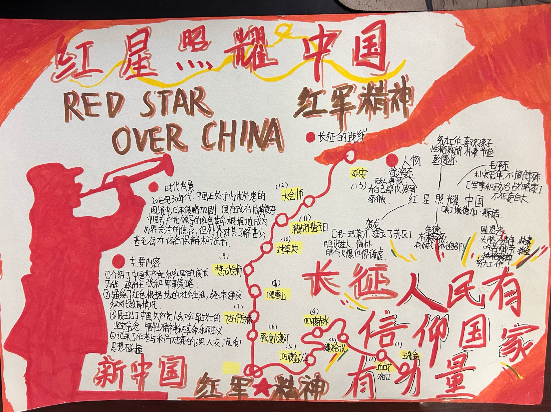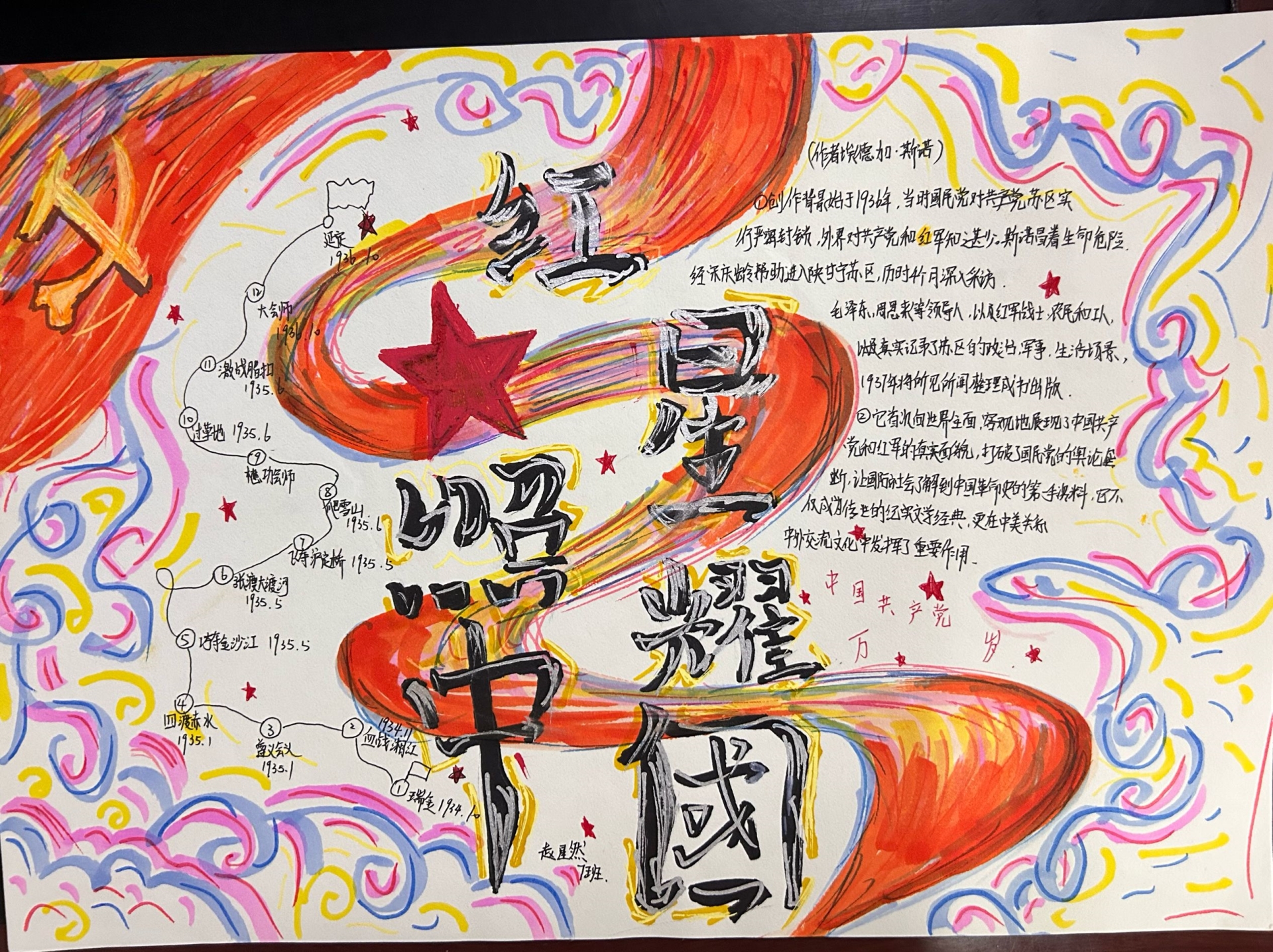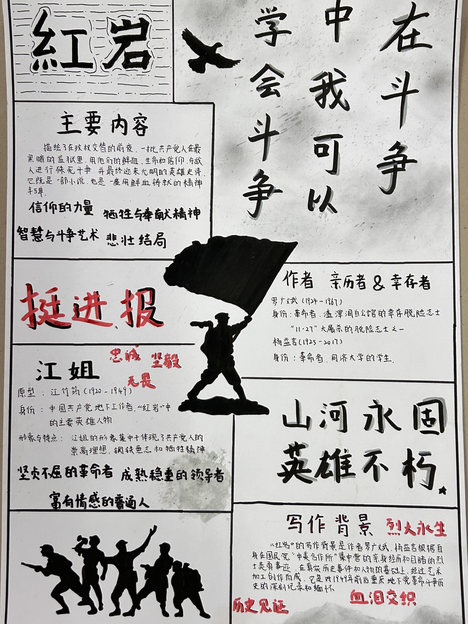 学生们在认真研读《红星照耀中国》《红岩》等经典著作后,满怀热情地投入到了手抄报的创作中。一方小小的画纸,成了他们抒发爱国之情的广阔天地。有的同学用细腻的笔触,画出了红军战士翻越雪山草地的坚毅身影,再现了江姐在狱中绣红旗的动人场景;有的同学则用工整的字迹,认真摘录了书中的经典段落,并写下了自己真挚的读后感言。“我看到了信仰的力量”“今天的幸福生活来之不易”,一句句稚嫩却坚定的话语,是孩子们与历史对话后最真诚的回响。