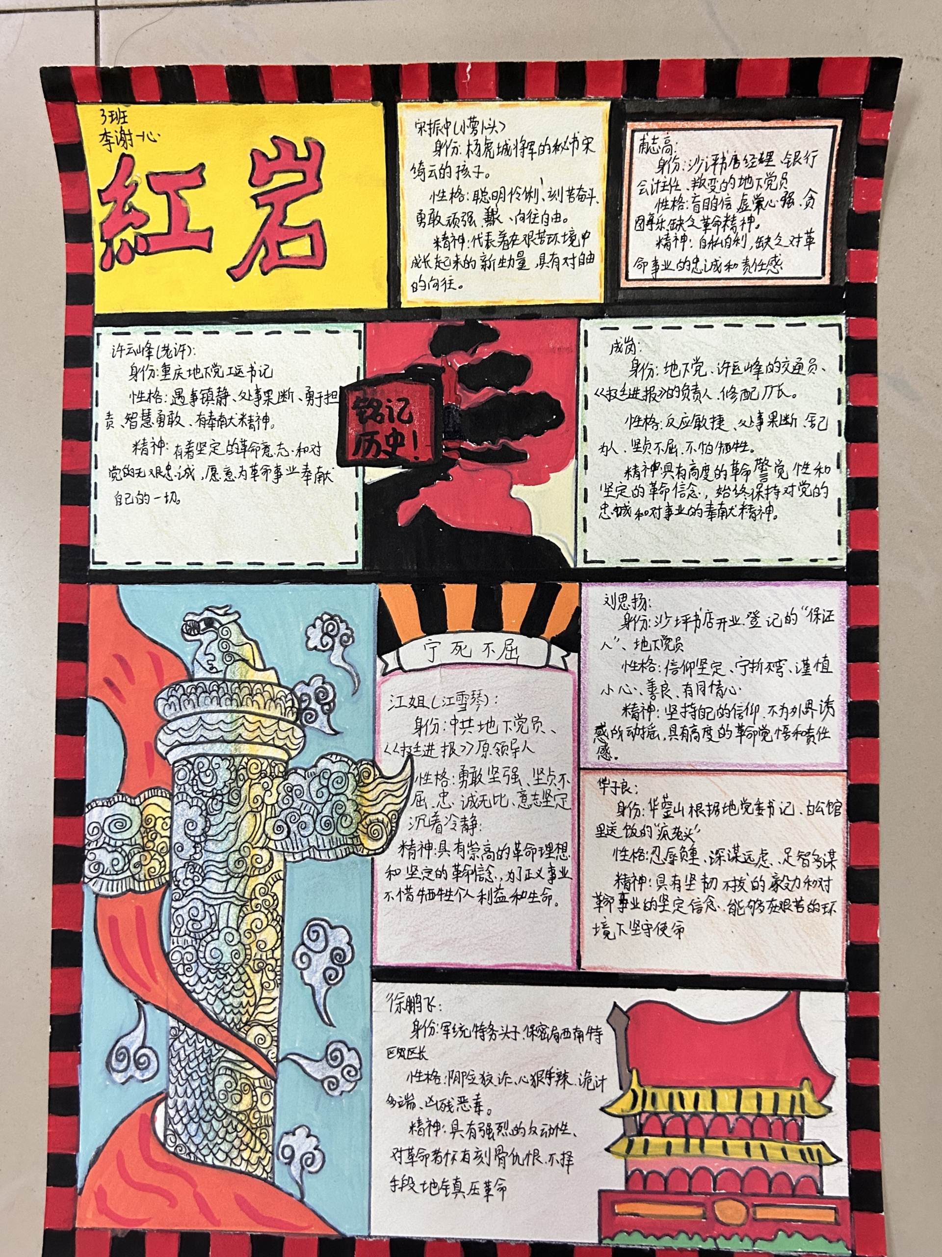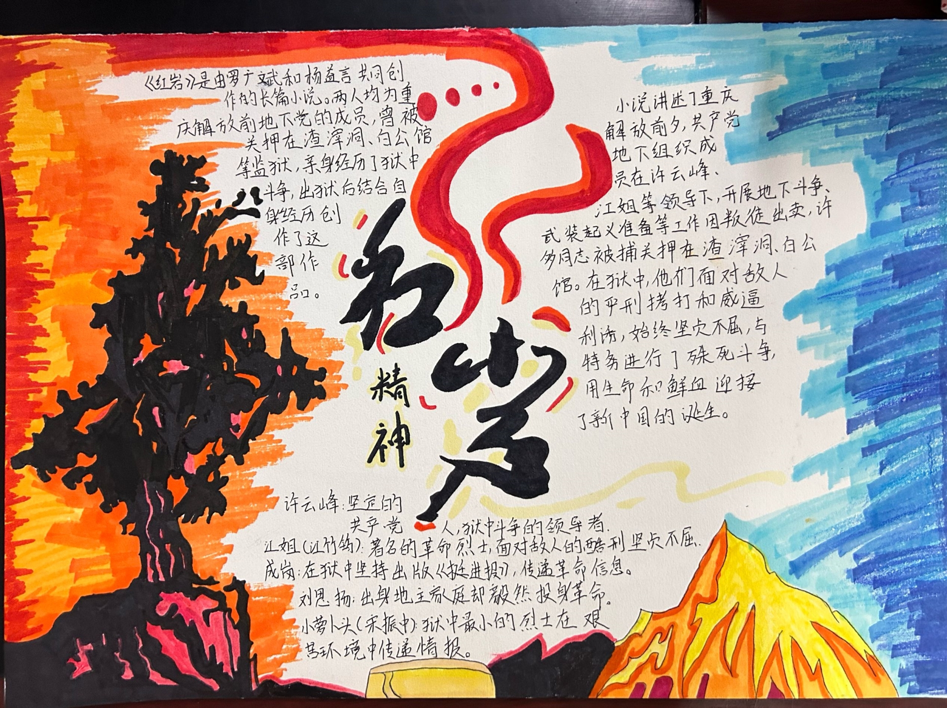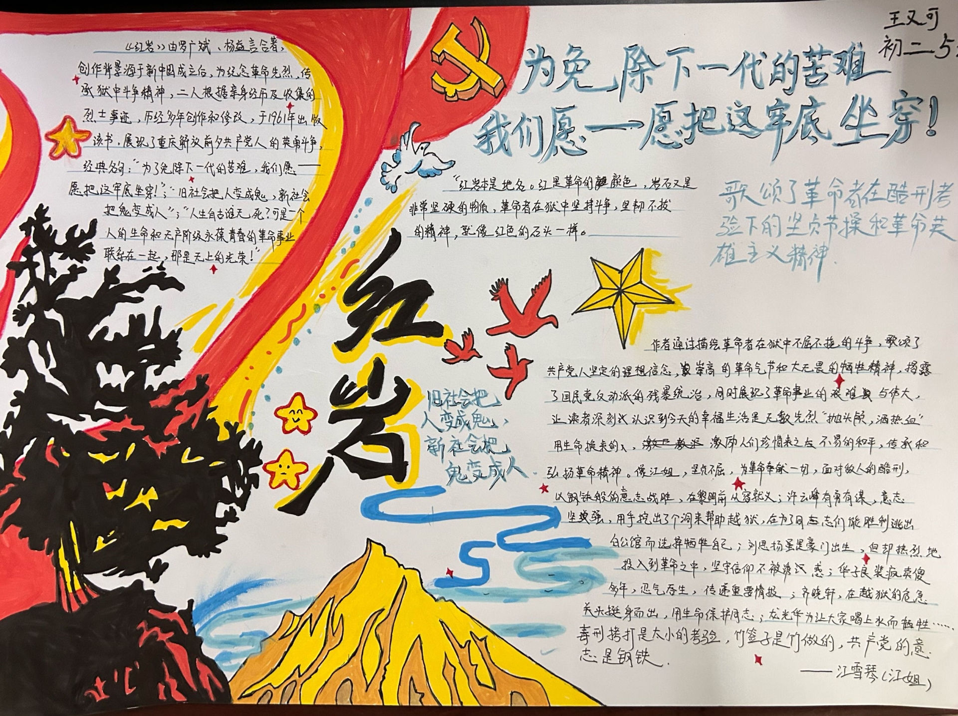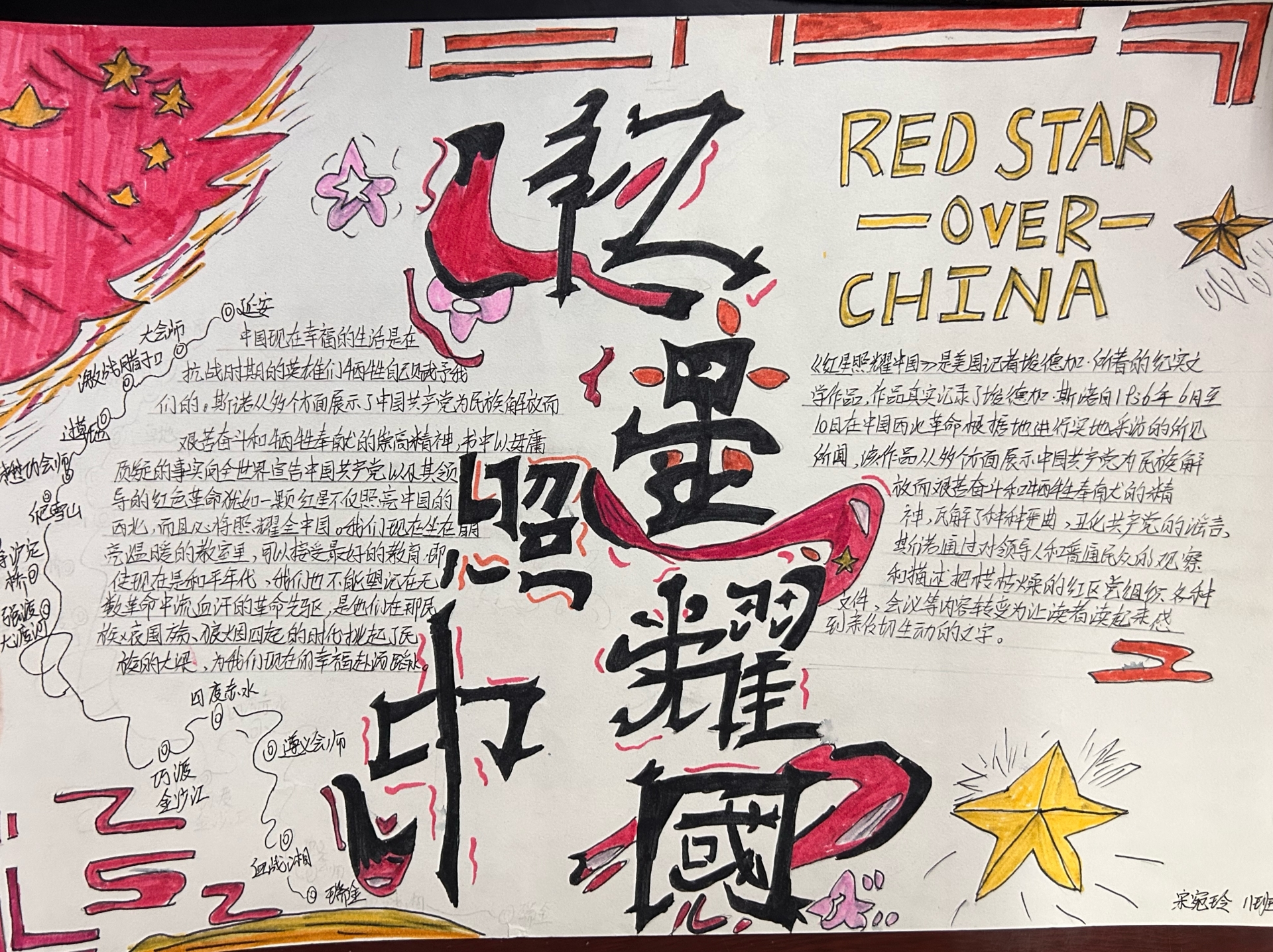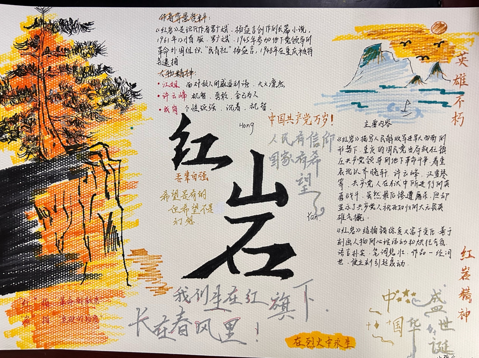 学生们在认真研读《红星照耀中国》《红岩》等经典著作后,满怀热情地投入到了手抄报的创作中。一方小小的画纸,成了他们抒发爱国之情的广阔天地。有的同学用细腻的笔触,画出了红军战士翻越雪山草地的坚毅身影,再现了江姐在狱中绣红旗的动人场景;有的同学则用工整的字迹,认真摘录了书中的经典段落,并写下了自己真挚的读后感言。“我看到了信仰的力量”“今天的幸福生活来之不易”,一句句稚嫩却坚定的话语,是孩子们与历史对话后最真诚的回响。