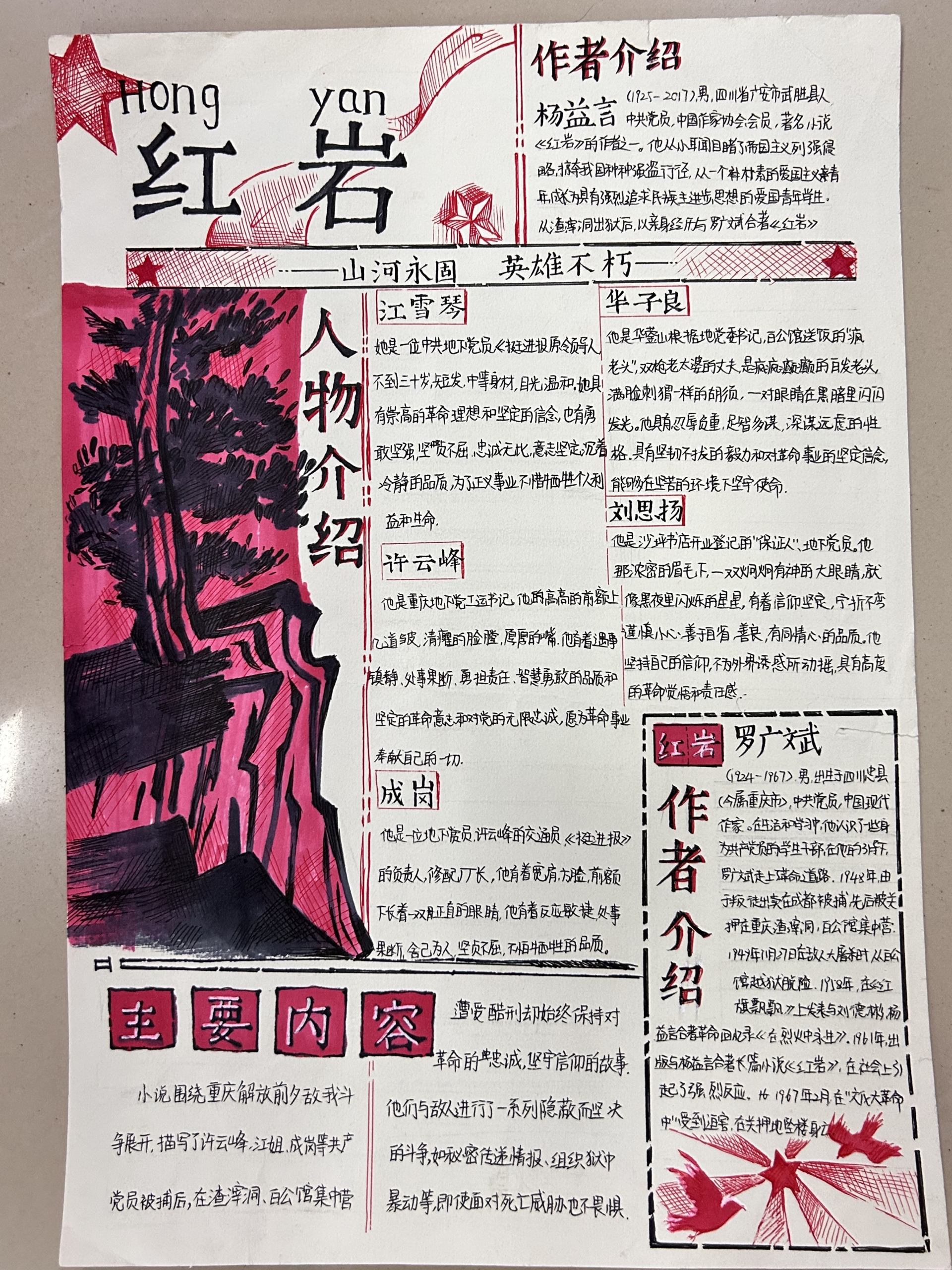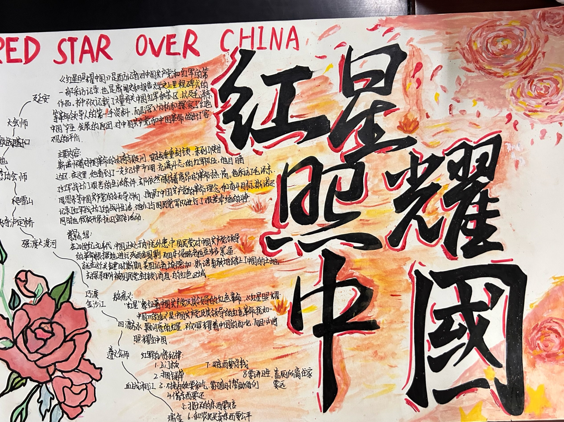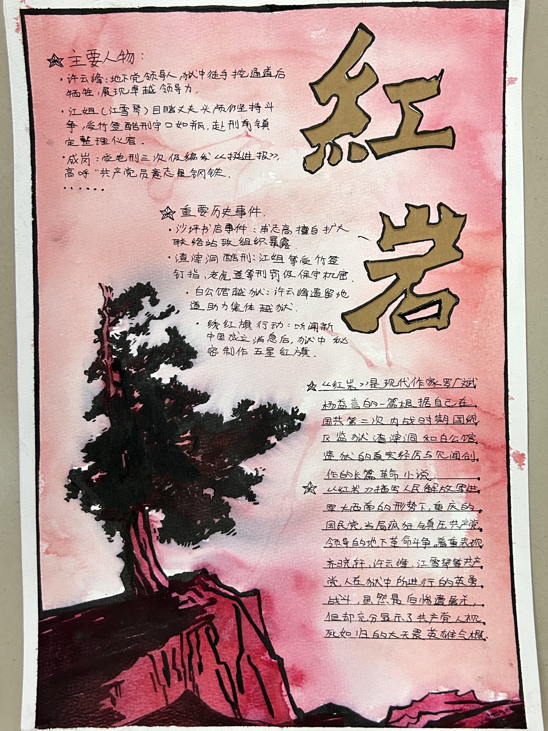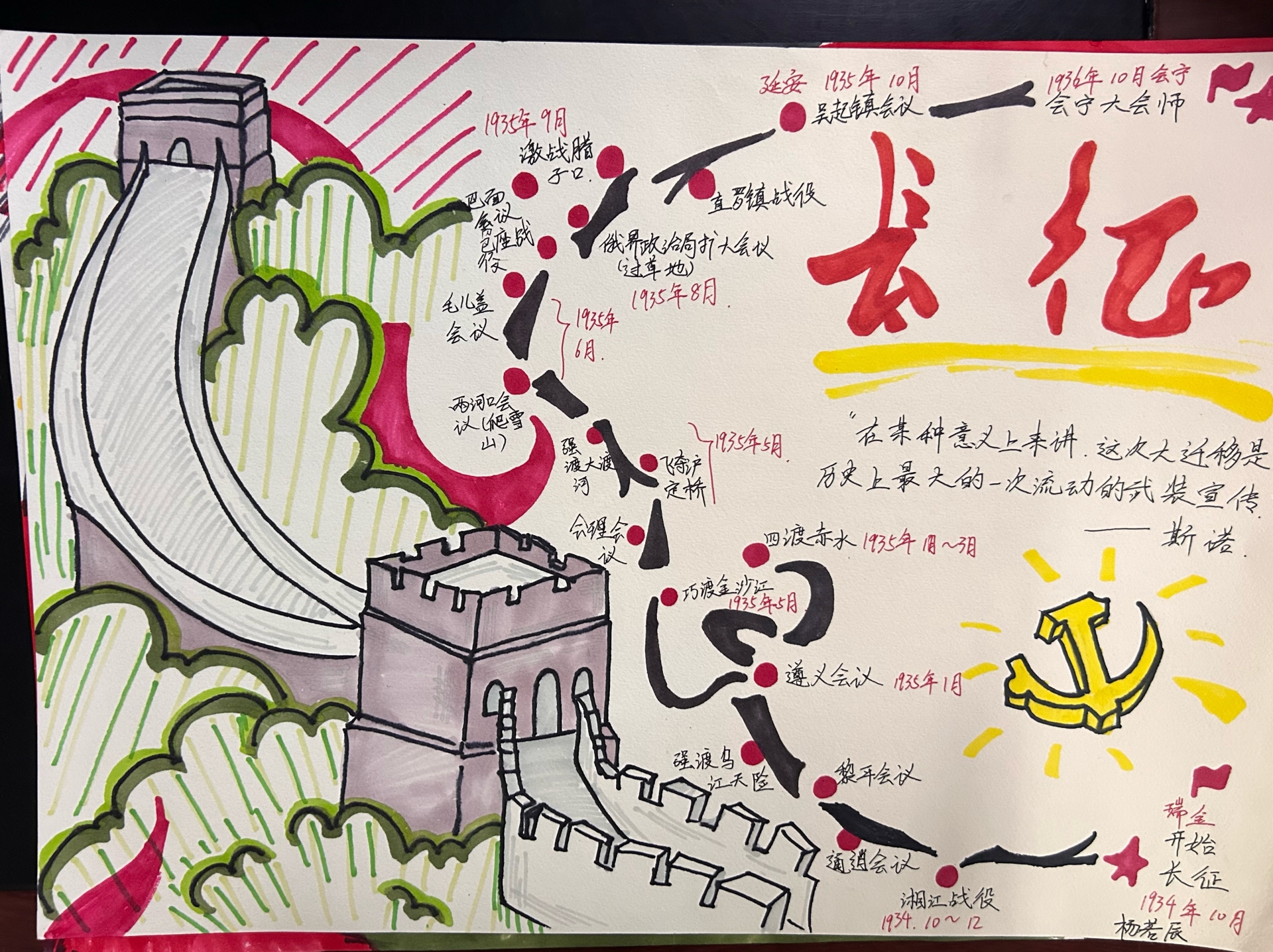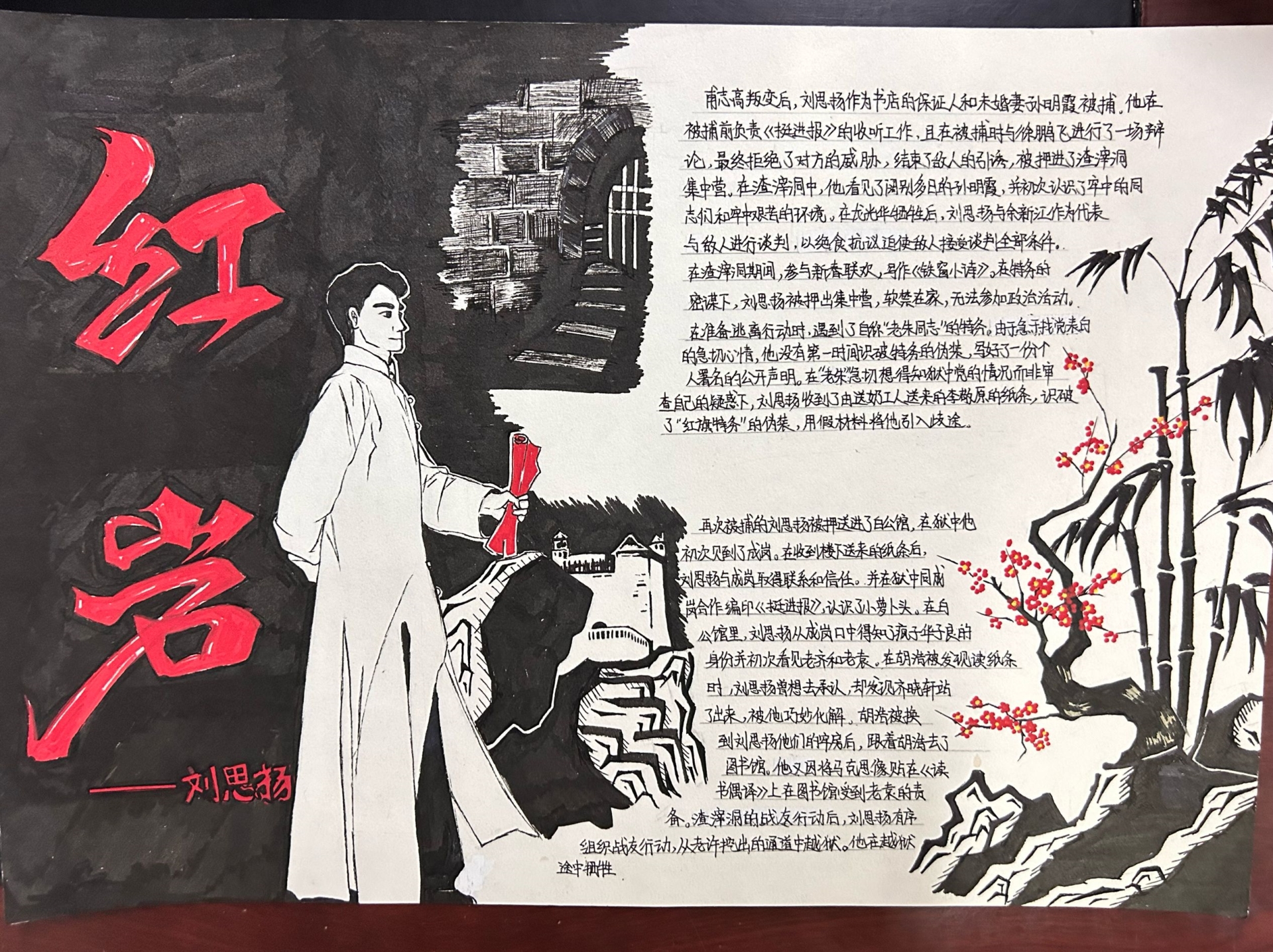 学生们在认真研读《红星照耀中国》《红岩》等经典著作后,满怀热情地投入到了手抄报的创作中。一方小小的画纸,成了他们抒发爱国之情的广阔天地。有的同学用细腻的笔触,画出了红军战士翻越雪山草地的坚毅身影,再现了江姐在狱中绣红旗的动人场景;有的同学则用工整的字迹,认真摘录了书中的经典段落,并写下了自己真挚的读后感言。“我看到了信仰的力量”“今天的幸福生活来之不易”,一句句稚嫩却坚定的话语,是孩子们与历史对话后最真诚的回响。