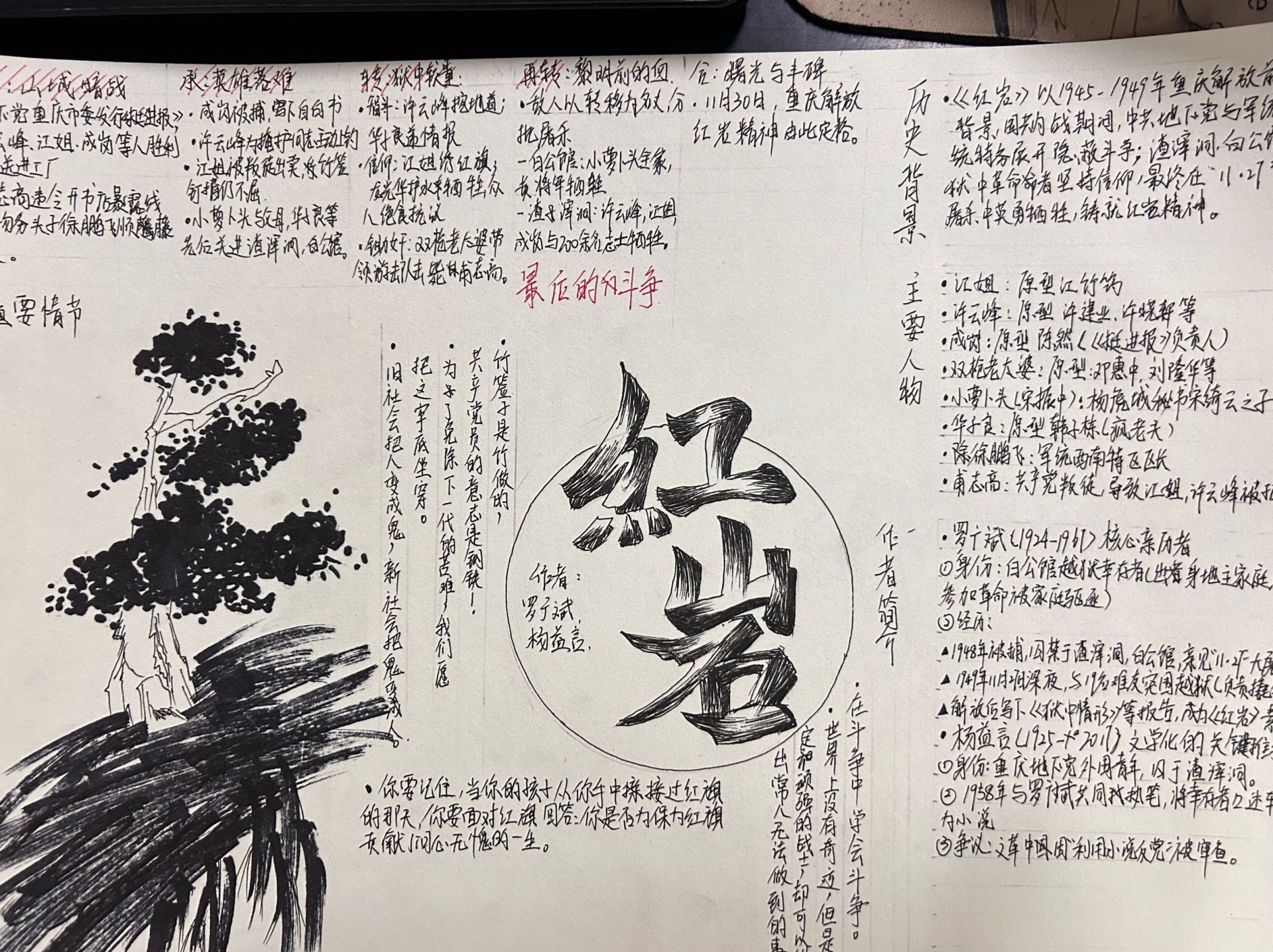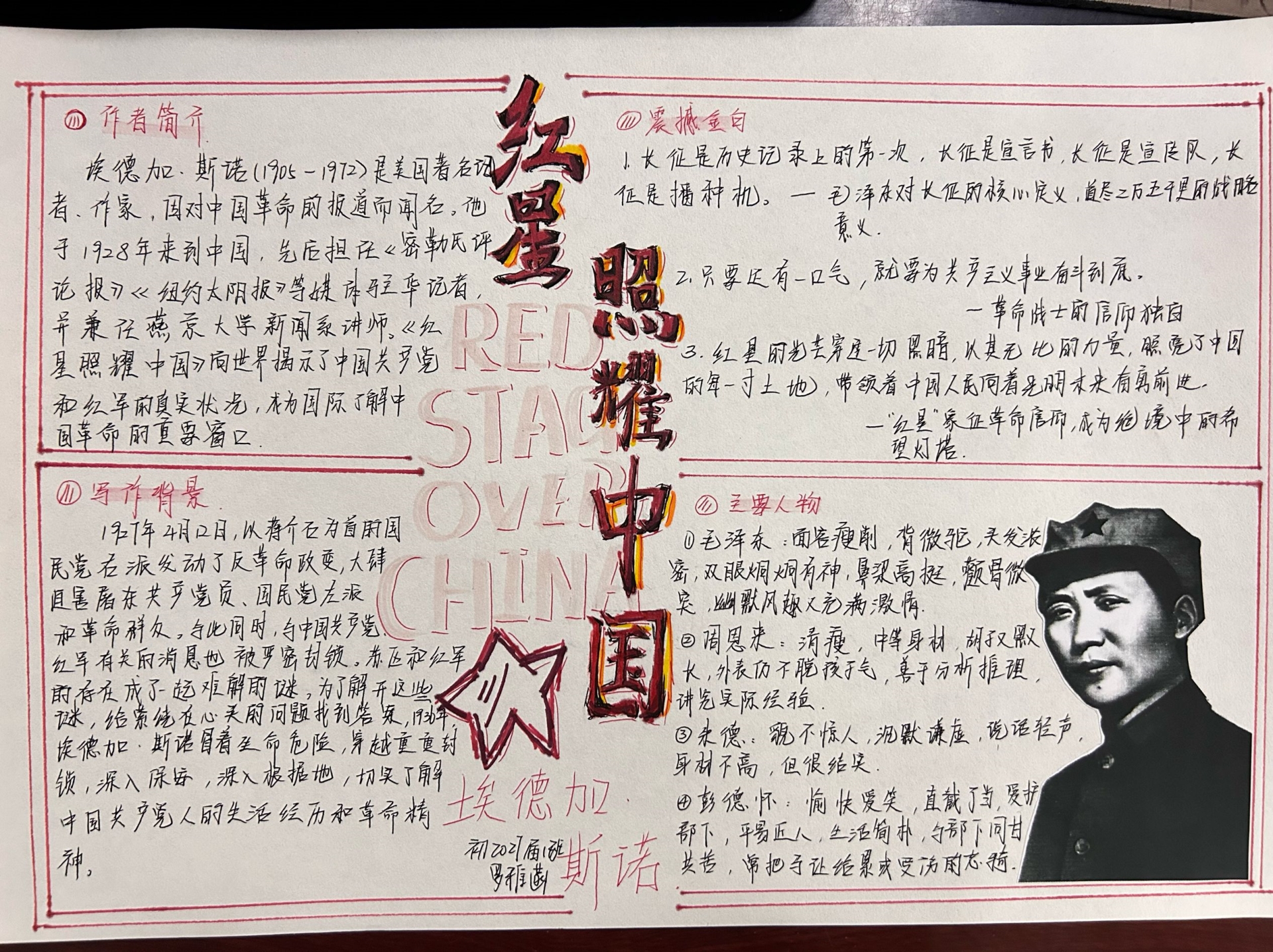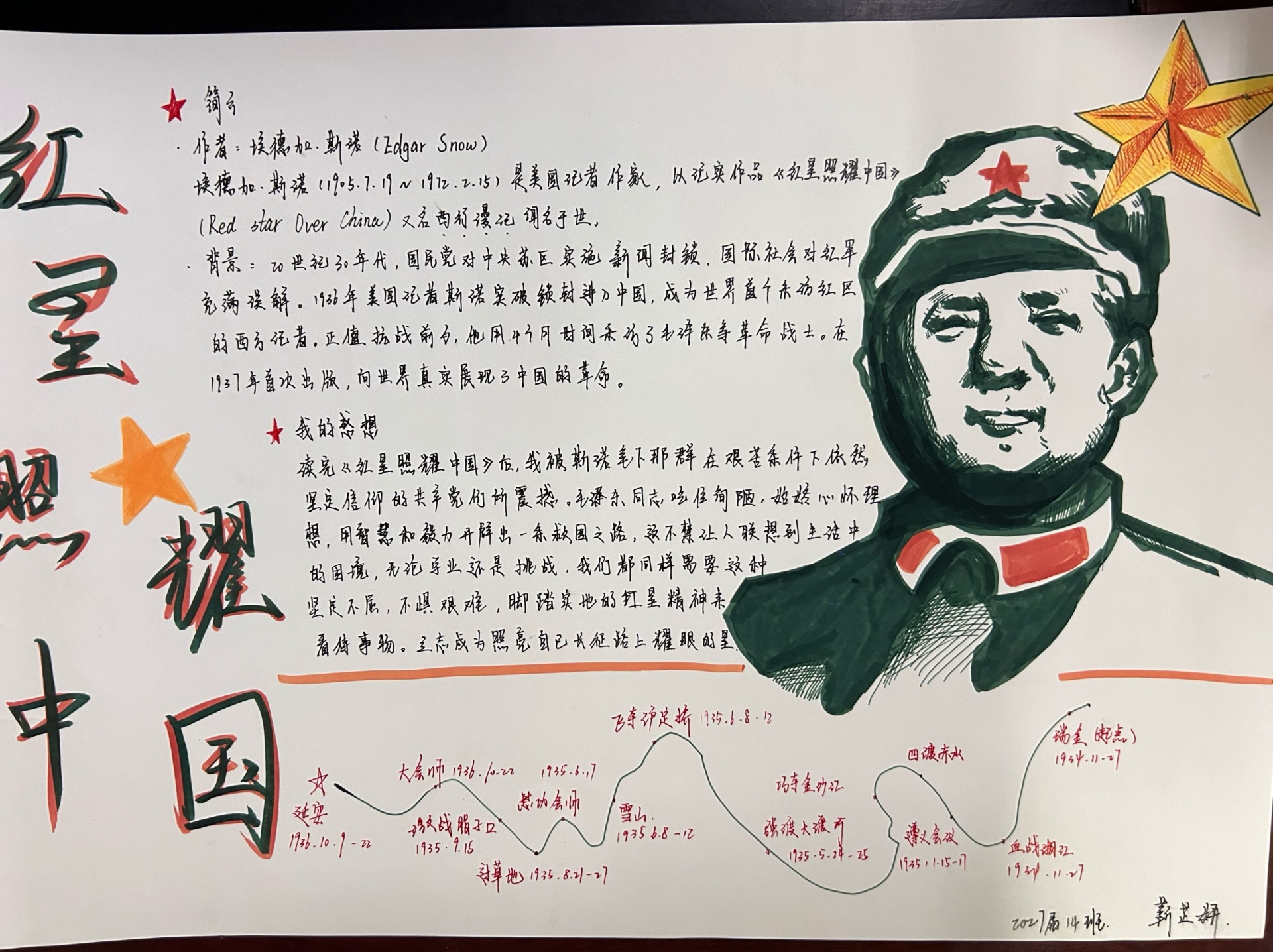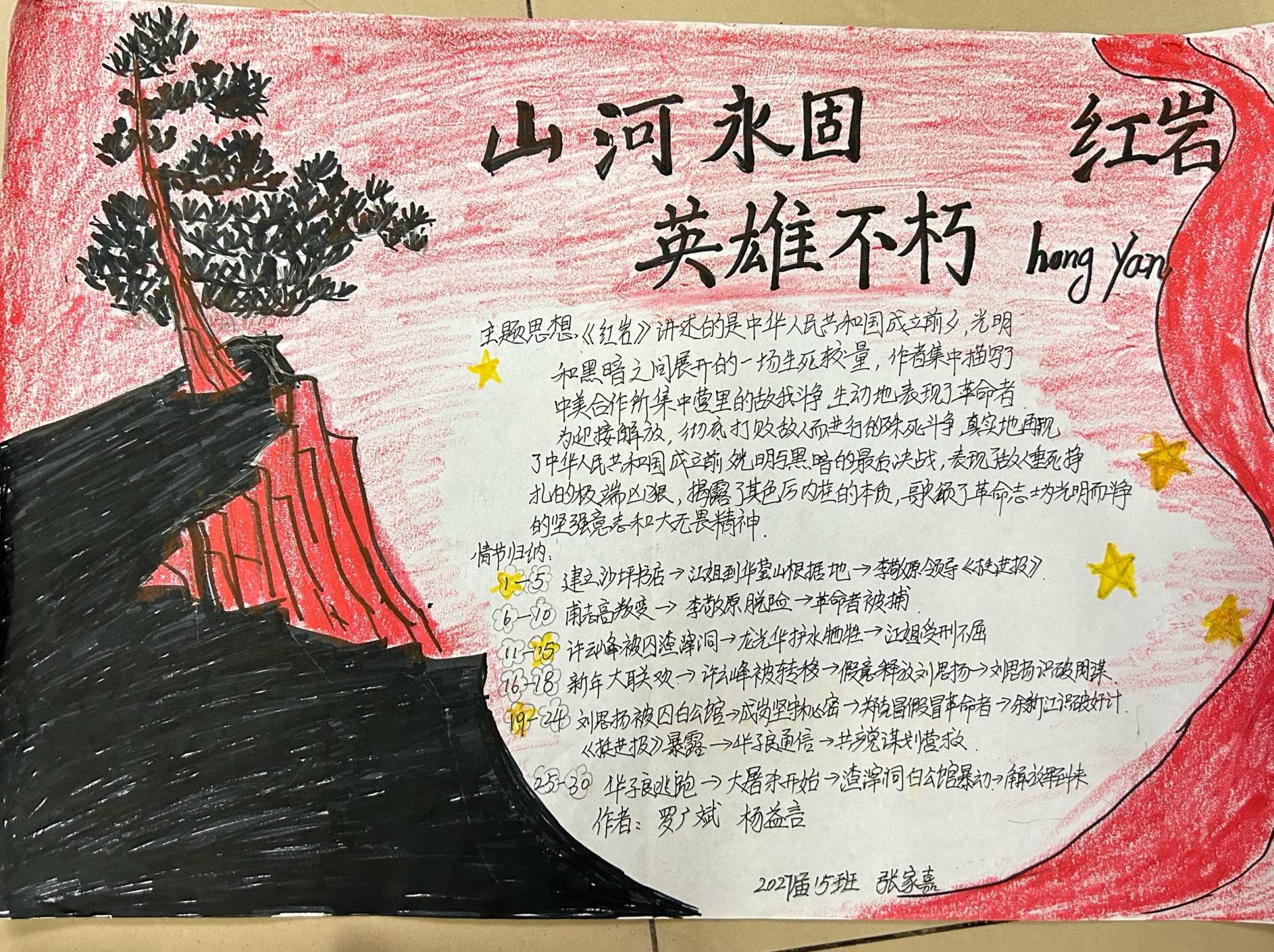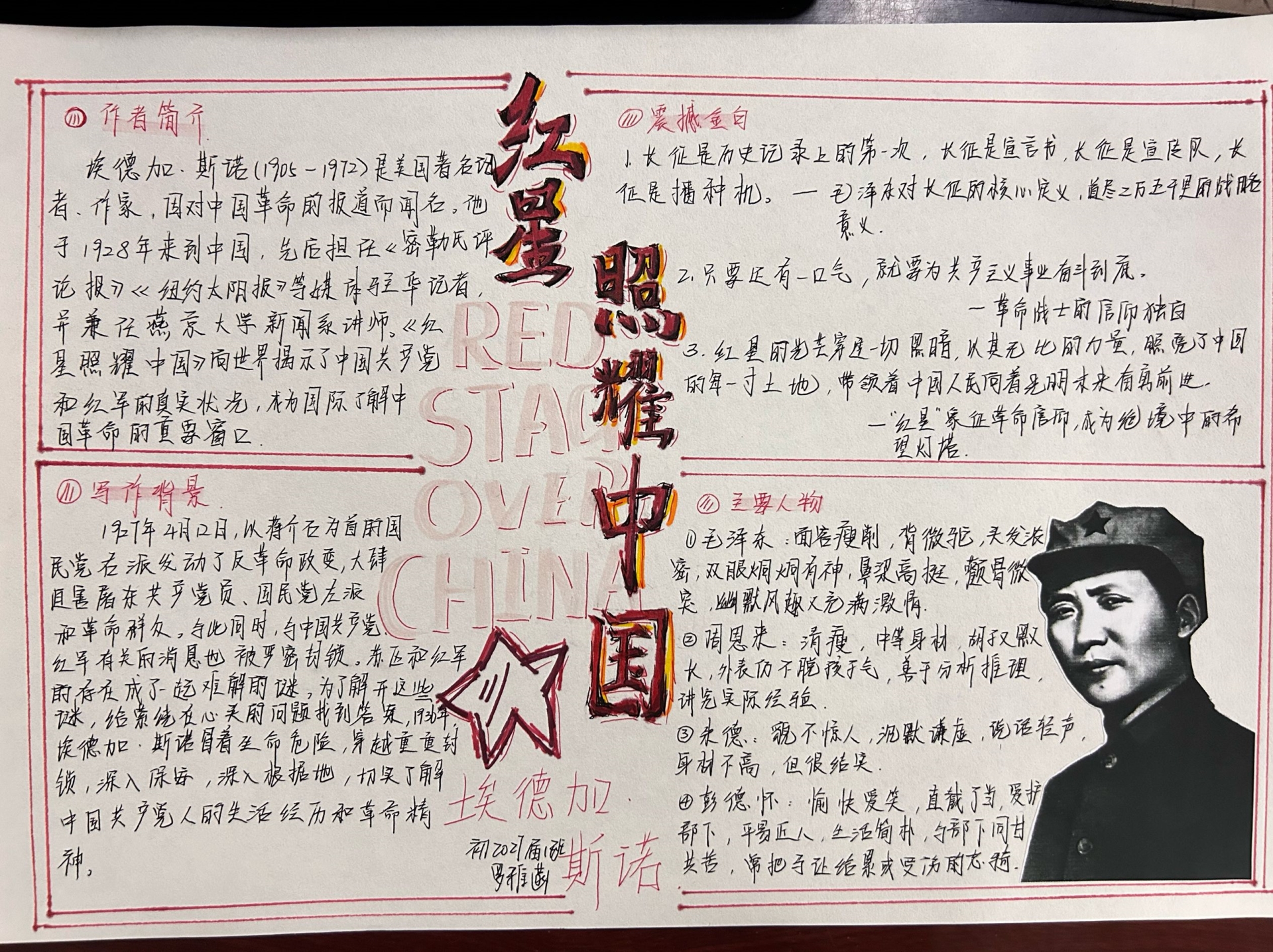 学生们在认真研读《红星照耀中国》《红岩》等经典著作后,满怀热情地投入到了手抄报的创作中。一方小小的画纸,成了他们抒发爱国之情的广阔天地。有的同学用细腻的笔触,画出了红军战士翻越雪山草地的坚毅身影,再现了江姐在狱中绣红旗的动人场景;有的同学则用工整的字迹,认真摘录了书中的经典段落,并写下了自己真挚的读后感言。“我看到了信仰的力量”“今天的幸福生活来之不易”,一句句稚嫩却坚定的话语,是孩子们与历史对话后最真诚的回响。
