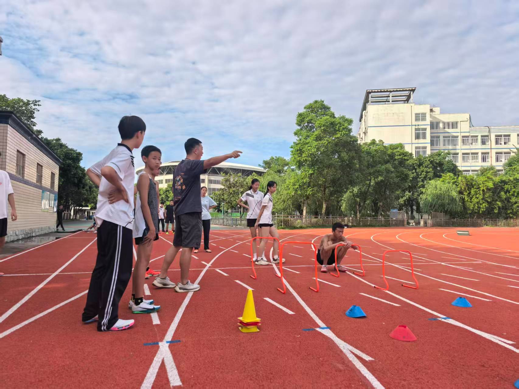 但若说最让人钦佩的,当属他带领田径训练队的“独门心法”。不同于传统训练中单一的重复练习,任老师的训练课堂总是充满“巧思”。他会根据每位队员的身体素质、运动特长和性格特点,量身定制个性化训练方案:对于爆发力强但耐力不足的队员,他会设计间歇跑与力量训练结合的课程;对于技术动作不规范的队员,他会拿着摄像机记录训练过程,逐帧分析细节,手把手纠正姿势。我们经常都会看到他为一名队员调整起跑姿势,从脚掌落地的角度到手臂摆动的幅度,都耐心讲解、反复示范,直到队员找到最佳状态。“训练不是蛮干,要让每个孩子都能在自己的节奏里进步,找到运动的乐趣。”他始终坚信,科学的方法远比盲目加量更重要,而这也让他带领的田径队多次在区级、市级比赛中斩获佳绩,更培养出一批又一批热爱田径、勇于拼搏的学生。