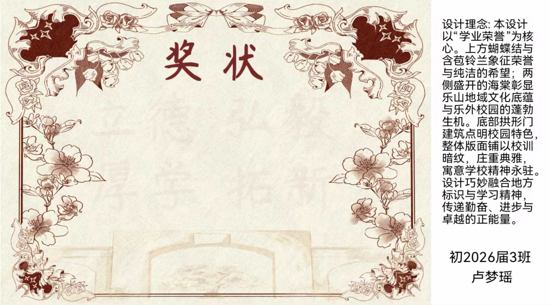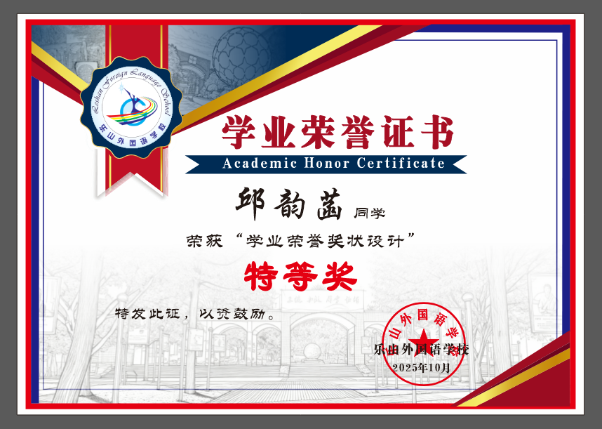 当创意碰撞校园,当灵感邂逅荣誉,乐山外国语学校“学业荣誉奖状设计”大赛圆满落幕!经过层层评选,一批兼具美感与深意的设计作品脱颖而出,现将获奖名单新鲜奉上,快来看看有没有你认识的TA~