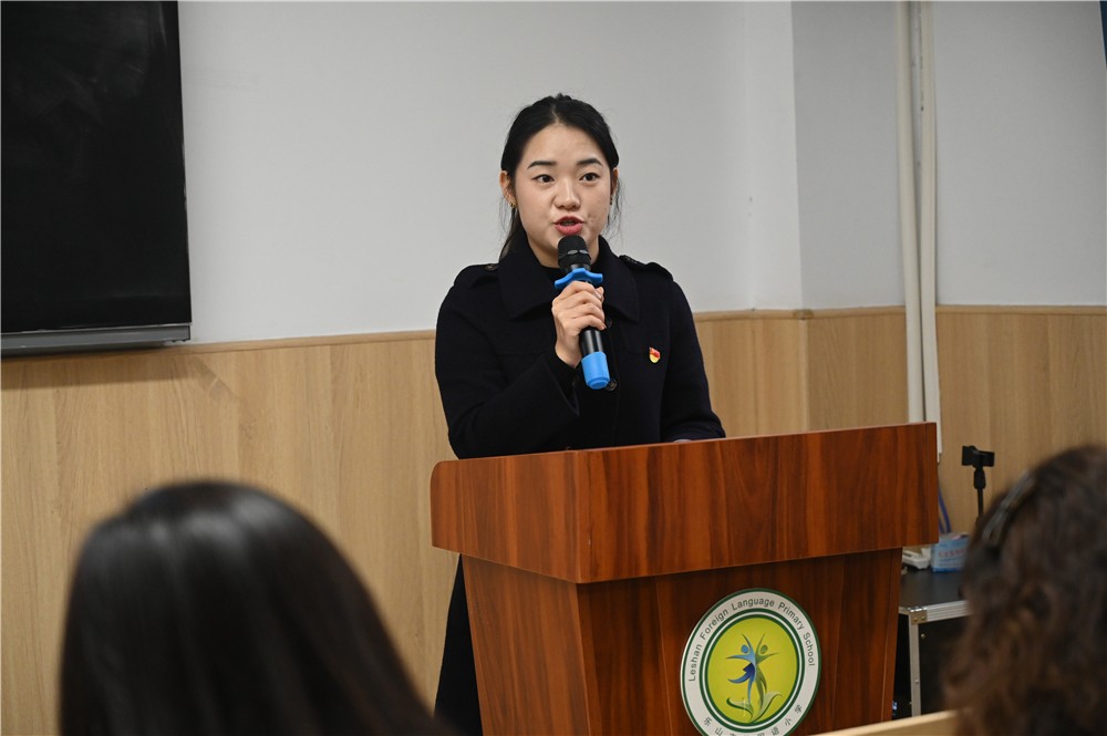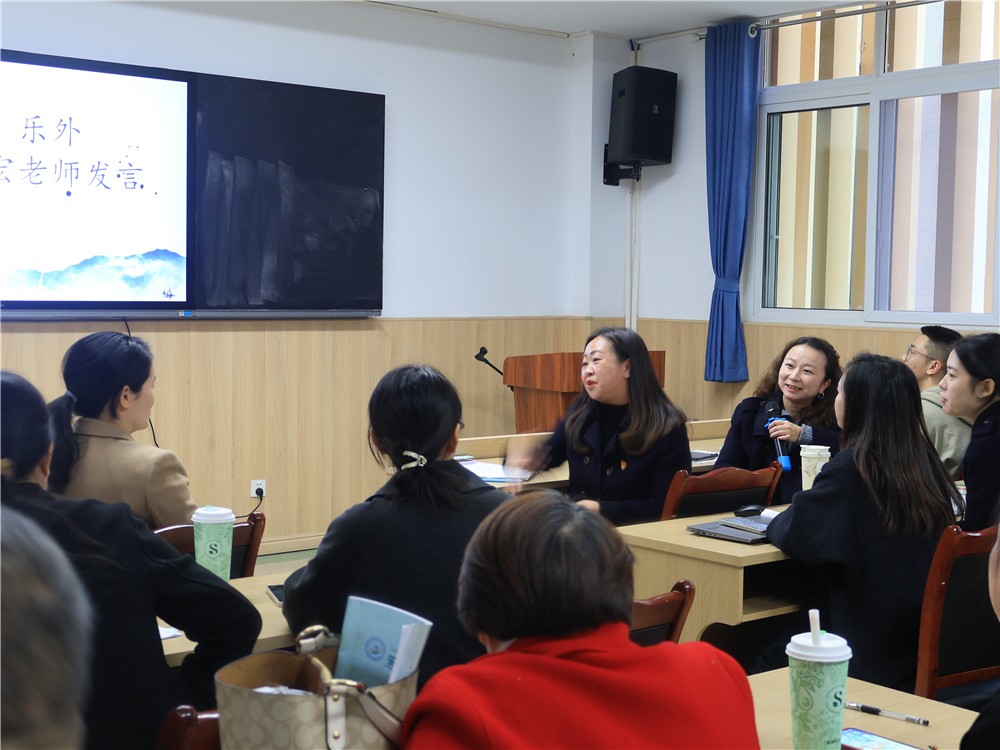 乐外初中部教学部部长郭宏老师总结致辞。她首先向滟小教育同仁致以诚挚谢意,并指出:小学重在奠基,初中贵在进阶,小初贯通实乃提升育人质量的关键路径。语文教师当以“文学浸润”对抗“碎片冲击”,以专业素养守护学生精神成长。最后,以“贯通·共进·致远”为脉络,为本次联合教研活动摹画了教育新图景。